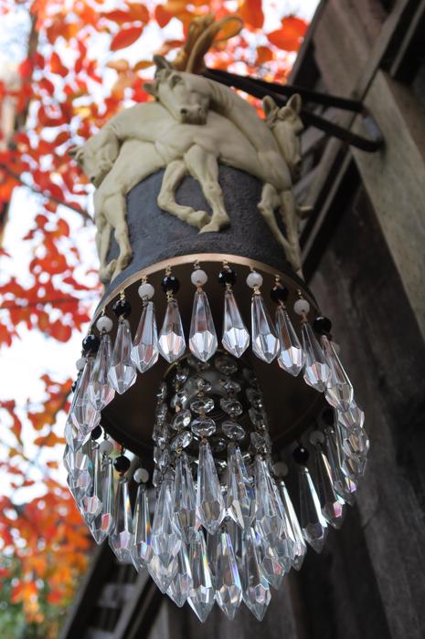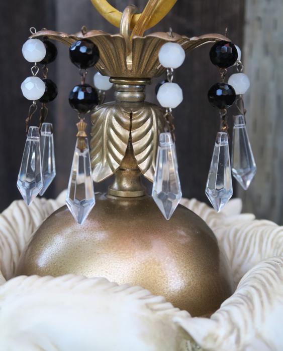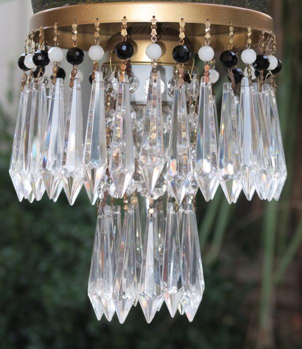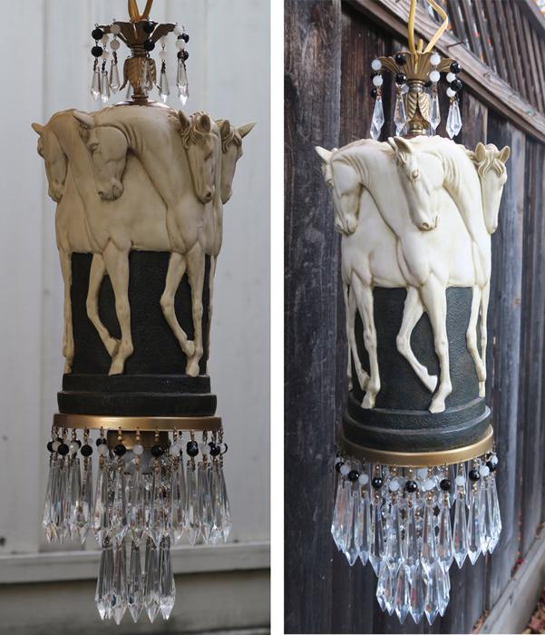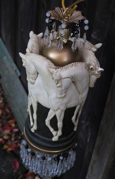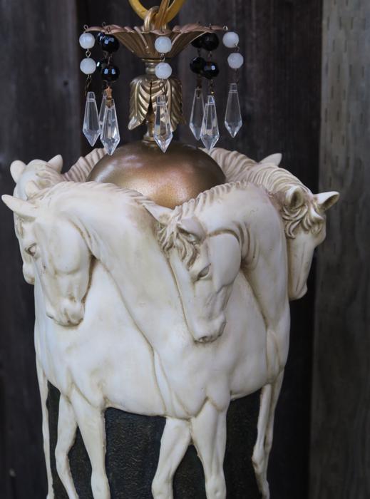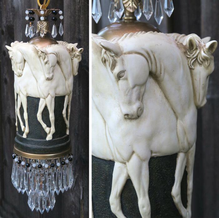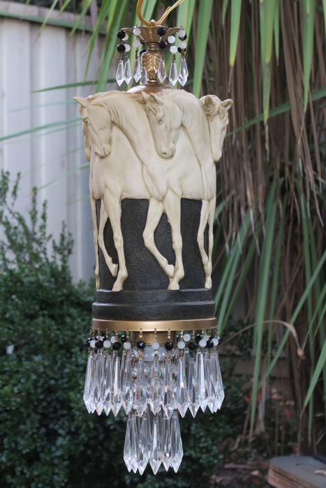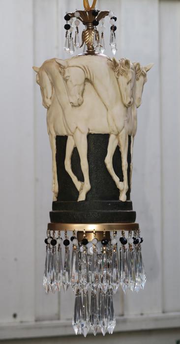 Stallion Horse ceiling install chandelier with Sparkling Dazzling, Crystal Prisms and glass beads. A tier of large Icicle prisms adorned with black and white faceted glass beads around the bottom of the fixture; Fountain of dripping glass clear crystal prisms. The chandelier is a 1 light fixture, that takes a standard base size bulb up to 150 watt (not incl). New wiring and porcelain socket; The sale is for one chandelier; It is a ceiling fixture and comes with 35" long cord and also with a canopy set with mounting hardware wand 12.5" chain links and is ready to install in your home. The sale is for one fixture only - as shown. Fully working condition; All prisms and beads are there and intact, no chips, cracks etc.The fixture total measures about 23.5" tall x 8.25" at the widest point