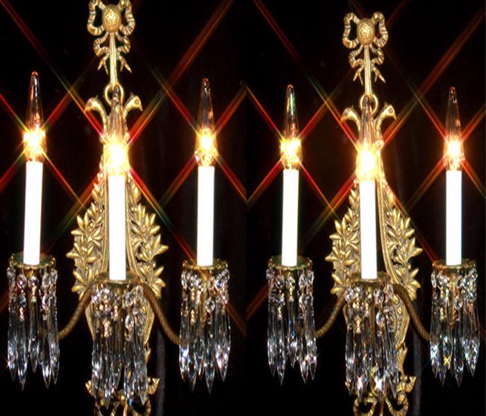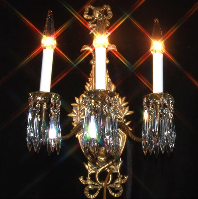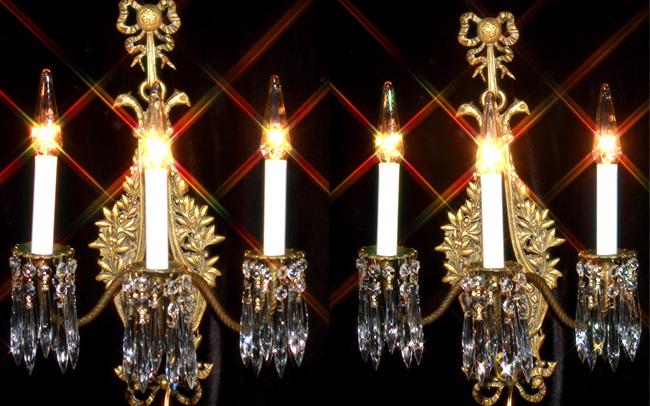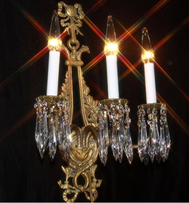 An outstanding PAIR of Sconces with tons of Dripping European Crystal Prisms and Crystal garlands. The metal I believe is solid cast gilt Bronze or brass with with beautiful patina and very detailed casting. Leaf garlands with Griffin bird heads and Bow top designs. Beautiful when lit. Each sconce is a 3 light fixture. The sconces come with cords with switches and can be used to plug in these into an outlet and hang anywhere in the room. Sconces use a small based chandelier size bulbs (not incl.) Old sconces - NEW Wiring - Great working order ready for hanging in your home. See photos, they part of description! The sale is for a pair. All crystals are intact - No broken or chipped crystals.The sconces measure total with crystals about 18" tall, 13" wide and about 8.5" deep
