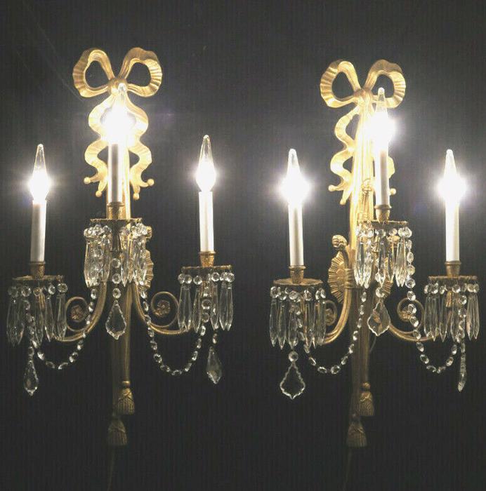 A pair of Vintage Gilt Bronze Brass Crystal lamp BOW top with tassels Sconces ROCOCO French Spanish ~ wall chandeliers ~ Accent light~ ~Dripping with Tons of Cascading sparkly Clear crystal Prisms Offered this Pair of beautiful old Classy large Vintage Sconces with Crystal Prisms and garland swags. The metal is gilt Bronze (or it may be cast brass) with beautiful gilt plated original finish and old charming patina. Beautiful design with Bow top and ornate desig n and large tassels at the bottom and flur-de -lis ornate arms. These sconces are 3 light fixtures. Great working order ready for hanging in your home. These sconces can be wired into a wall - as they are wall fixtures and come with mounting hardware; (the complete mounting hardware set comes with the sconces) or, cord with switch in line can be added to plug these into an outlet and hang anywhere in the room. I believe these fixtures would date somewhere from 1930-1950-s. These are European sconces, French Rococo style, Spain. Sconce uses small base chandelier bulbs - 3 of them up to 75watt each (not incl.).