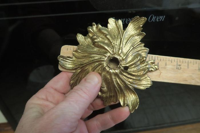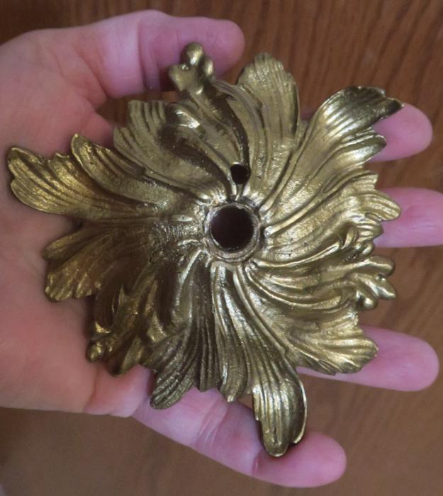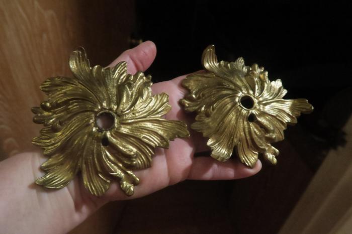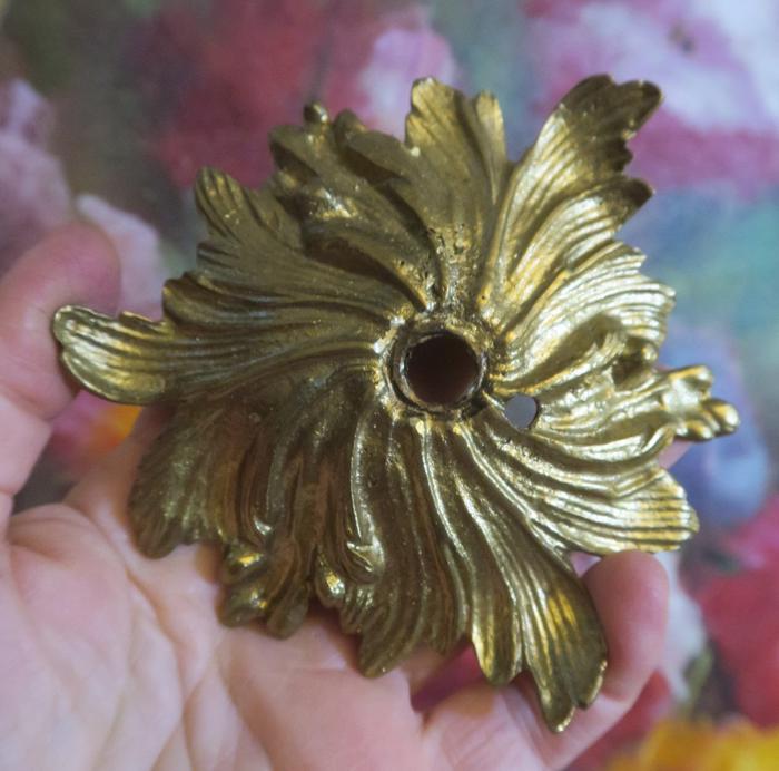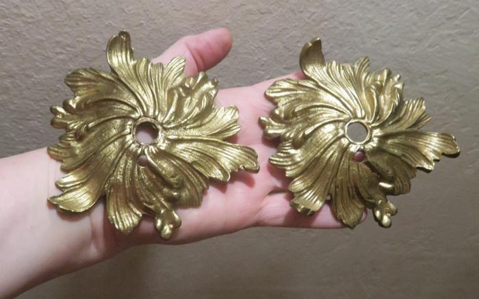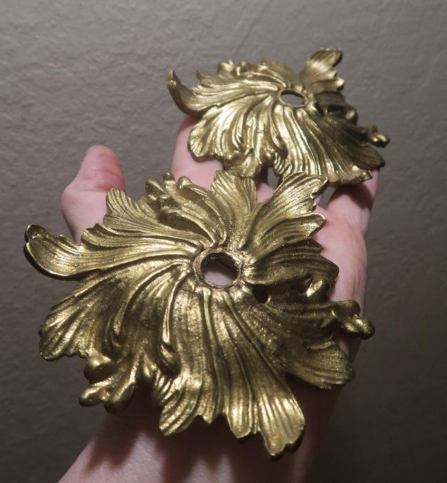 A pair of matching Gilt cast brass bronze lamp bobeche Parts ~ great for repair, Spain Please refer to the photos for the measurements**** Very ornate designs, dark old patina on the surface; Good old condition; See photos - they are part of description. Excellent compound for a chandelier, sconce or lamp , candlestick candelabra. sold as shown
