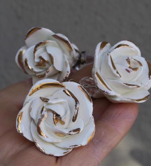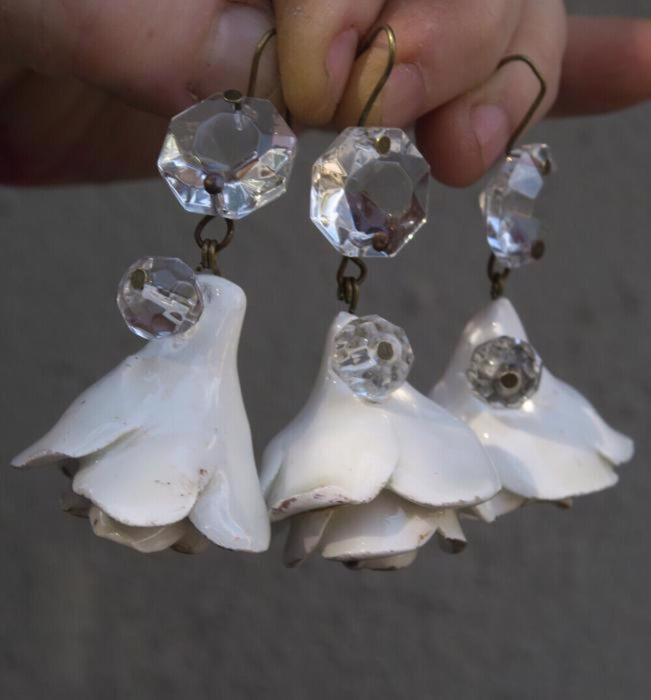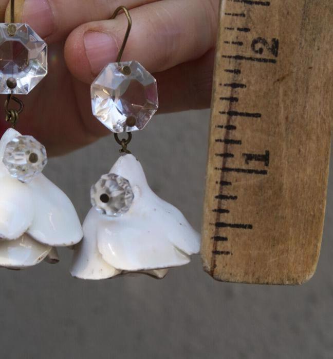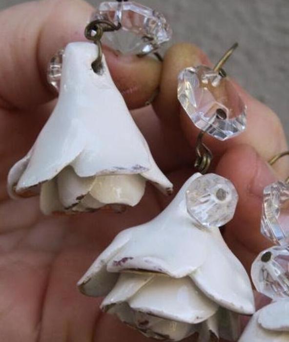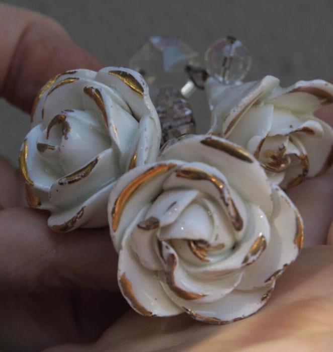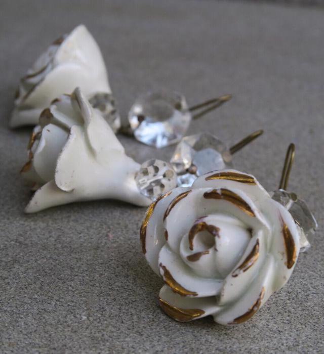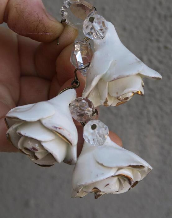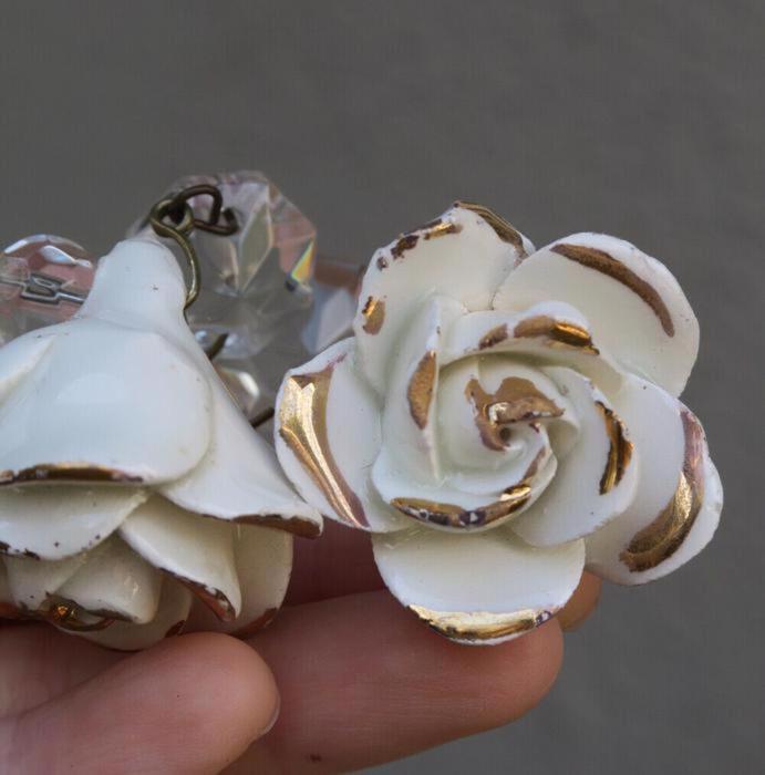 Please refer to the photos for the measurements***Offering this 2 Beautiful vintage porcelain Capodimonte White relief rose Crystal hanging Prism; Some nicks and scuffs may be seen on porcelain glazing common for old porcelain flower. Each prism has a bead strand on it with octagon crystal prism above the rose flower; The sale is for 2 rose prisms only.