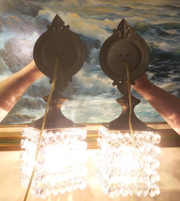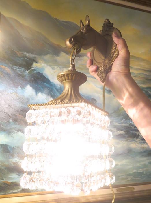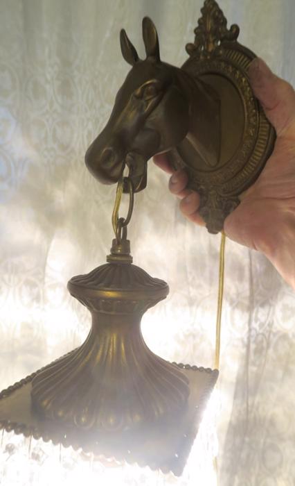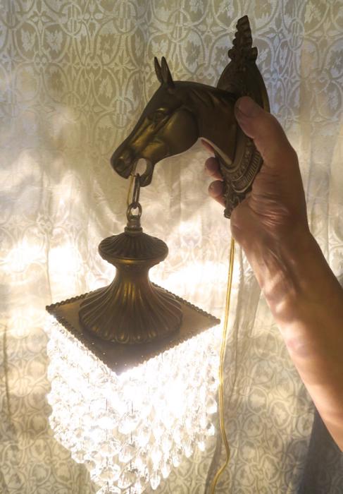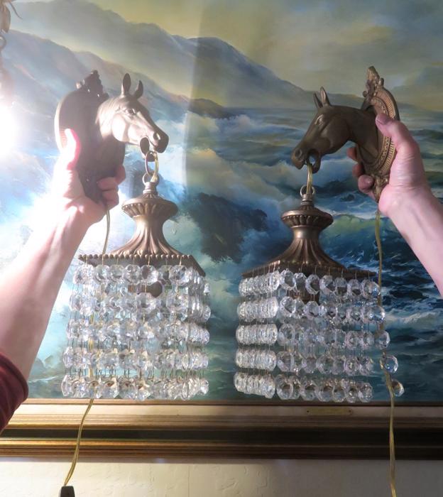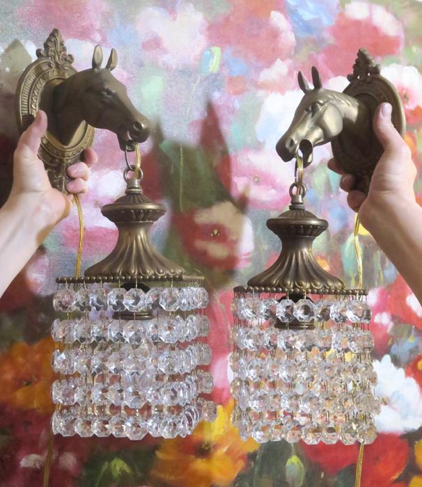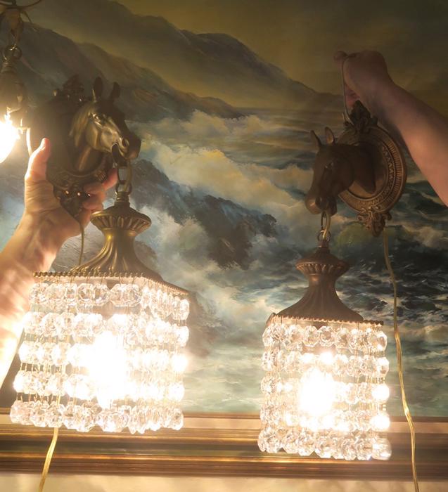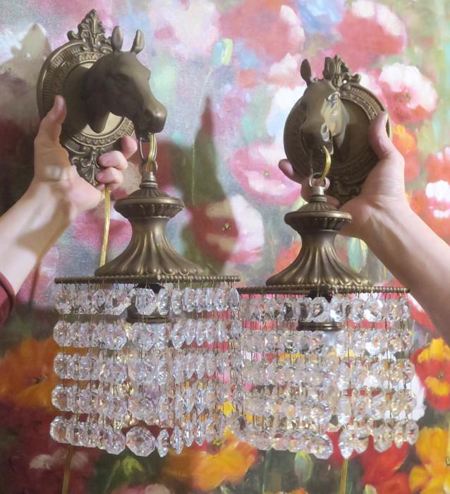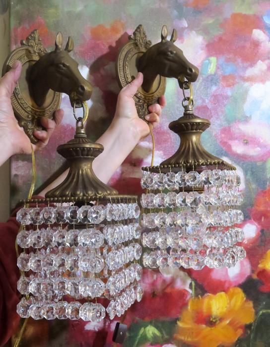 A Pair of old Vintage Brass lamp Sconce Horses hanging lantern shades with beaded rim designs with waterfall of dripping clear crystal large sized prism curtain garlands, Equestrian Barn lights. New Wiring. A truly spectacular pair of Horse head wall Sconces. Beautiful when lit. Each sconce is a 1 light fixture. Great design with horse heads and hanging ornate relief bronze meal lanterns with old dark patina, so charming! Each lantern has dripping clear crystal prisms cascading in layers looking like water fountain waterfalls. Ornate elaborate back plates; Great working order with new wiring and porcelain sockets, these sconces come with long cords with switch in line and plug at the end - ready to use. I believe these vintage sconces would date somewhere from 1940s. These are European sconces I believe, French or Spanish; Sconces are one light fixtures and take a standard size bulbs E26 (bulbs not incl.); The sale is for a Pair (set of 2 sconces). We do have multiple pairs available (total 3 pairs- 6 sconces to order from this listing if need multiple pairs) Great working condition with new wiring and porcelain sockets. The clear crystal prisms on the lanterns are all intact with all prisms that are there none missing or broken and sconces are in great old vintage condition ready to hang. Please see photos, they part of description! These sconces measure 19" by 5.5" wide by 7.75" deep, each crystal lantern is 7" tall by 5" wide square and the back plates are 5" wide