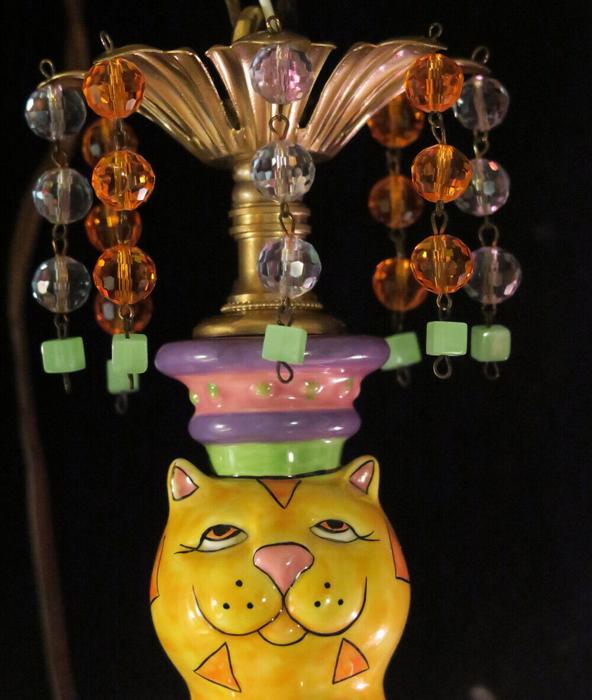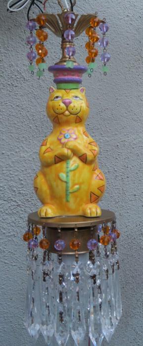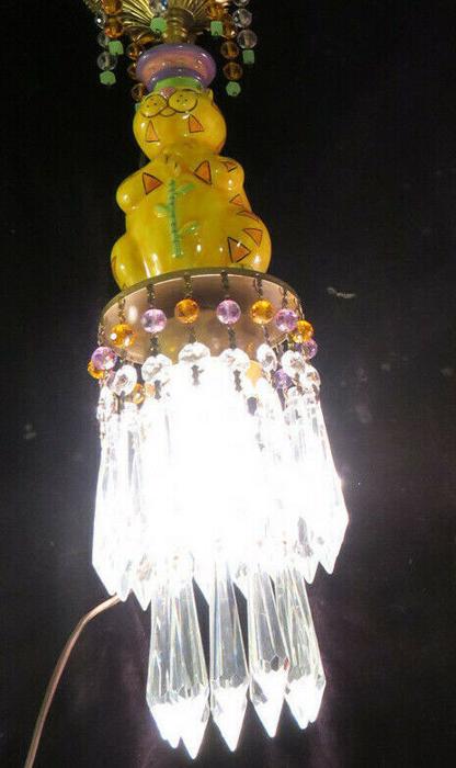 Beautiful vintage Pendant ceiling fixture lamp porcelain Cat with flower Beaded hanging lantern lamp, Faceted bead garland strands ~New wiring ~With relief very cool looking handpainted Yellow cat Porcelain posts ~ Leaf top crown design with dripping clear crystal prisms. the metal is a combination of brass and tole metal painted gold tone. A crown leaf top above the lantern it with jade, yellow and purple beads; New wiring and porcelain socket; Great working order, the lamp has a double tier of large clear Icicle prisms at the bottom of the lantern that put out rainbow sparkle with shine! All prisms are in great condition, no missing or broken prisms. Porcelain in great condition so are the beads. The sale is for one ceiling lamp - as shown. It is a ceiling install fixture, comes with a 30" long electrical cord with canopy set with mounting hardware and is ready to install in your home; The lamp uses a standard base size bulb - up to 150 watt . (not incl.) Please see photos, they part of description. The fixture measures total with prisms about 17" tall by 4.75" wide