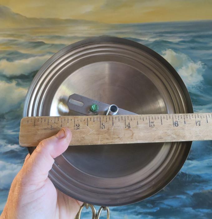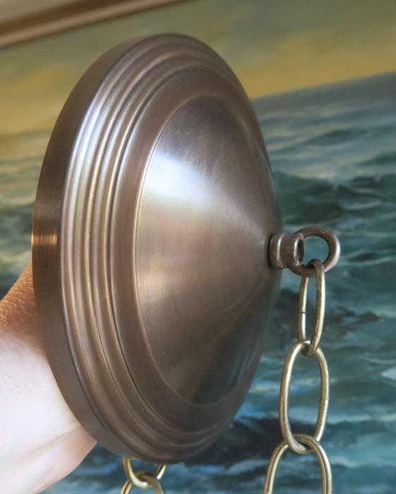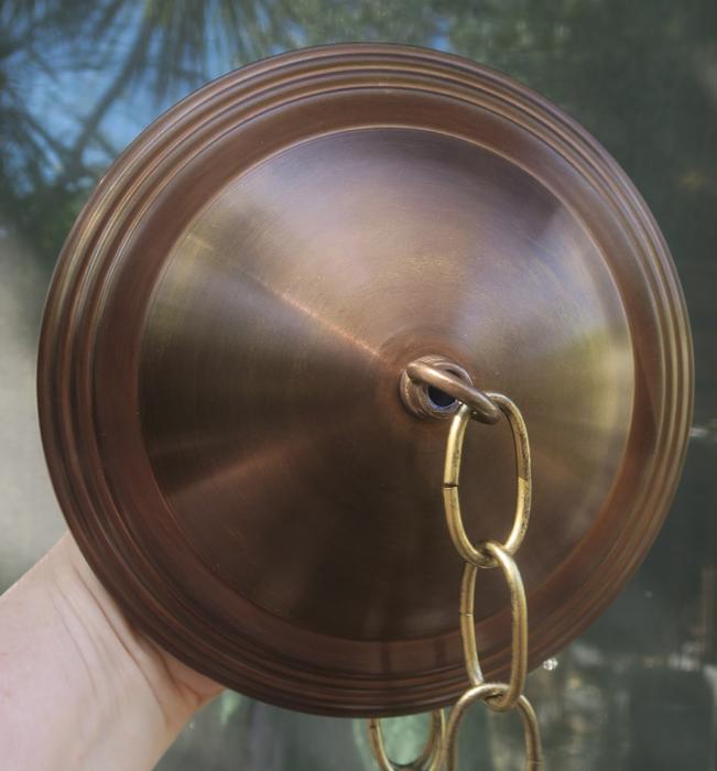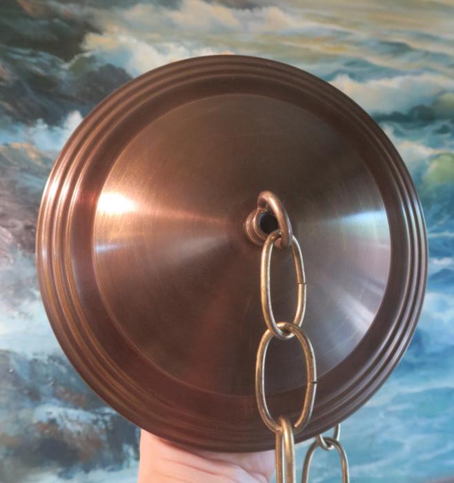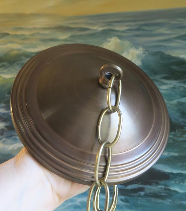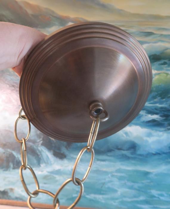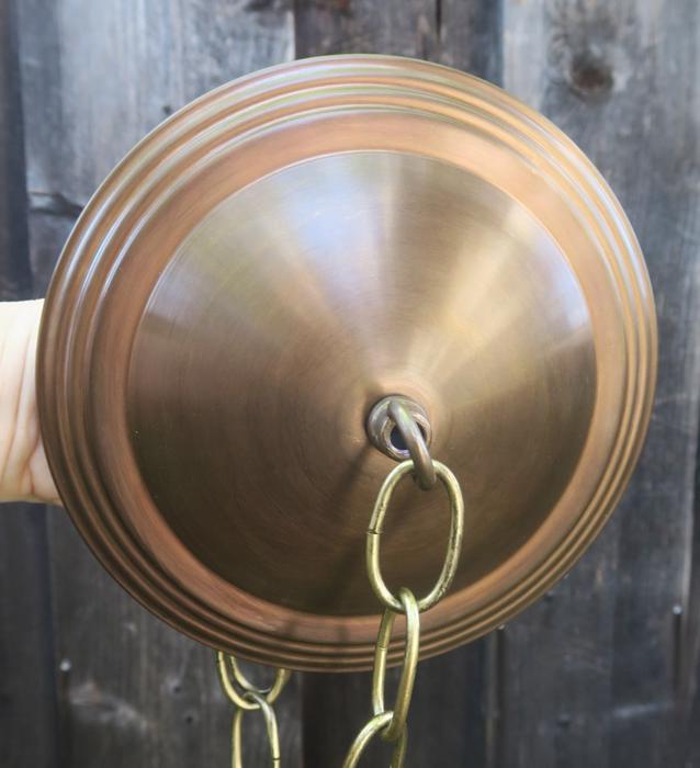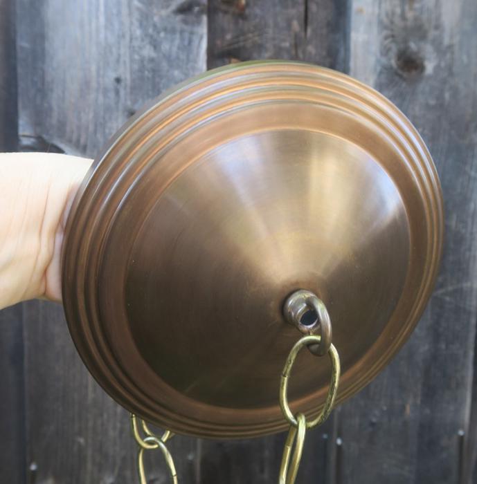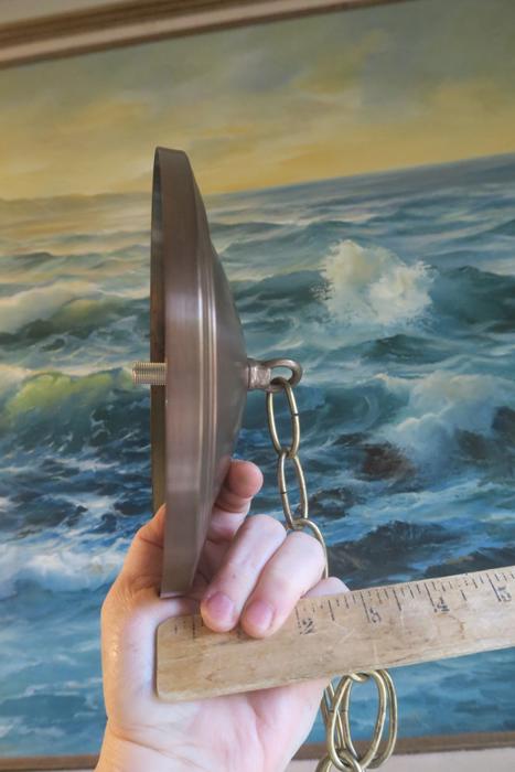 Please refer to the photos for the measurements***; it measures 7" in diameter , has a great old patina, The chain is 12.5" inches - if a longer chain is needed- just let me know. Vintage brass ceiling canopy with mounting hardware part set - a great part to use to hang your lamp or chandelier; the Canopy is in Good condition - as shown - ready to use- Please see photos, they are part of description; I do have multiples available