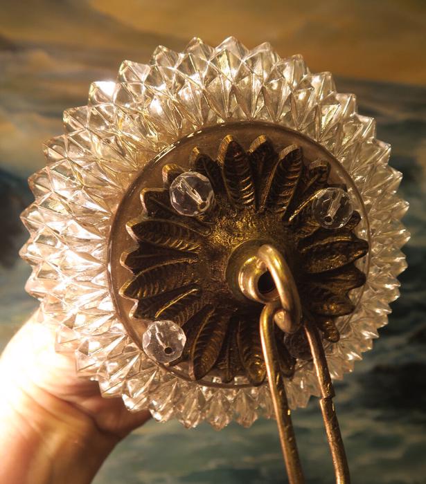 Please refer to the photos for the measurements**** the ornate chain Measures about 15" long. If a longer chain is needed - let me know. Brass and Tole metal ceiling cap with pressed crystal clear hobnail glass; Great condition - as shown - ready to use. Please see photos, they are part of description;