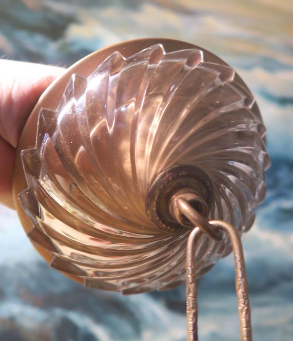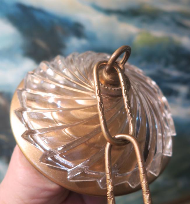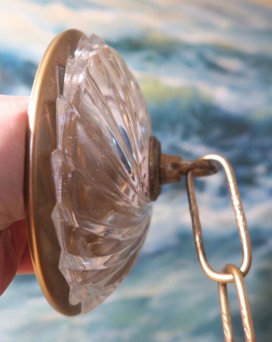 An old Tole Vintage large cut clear swirl Swirl glass and metal canopy chain lamp chandelier part Please refer to the photos for the measurements**** the canopy is about 5" in diameter; the ornate chain Measures about 12.5" long. If a longer chain is needed - let me know. Tole ceiling cap with cut crystal clear cut swirl glass; Great condition - as shown - ready to use. Please see photos, they are part of description; the sale is for one set as shown. In Excellent condition, No chips cracks or scratches