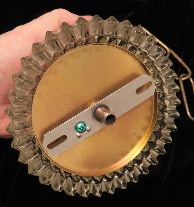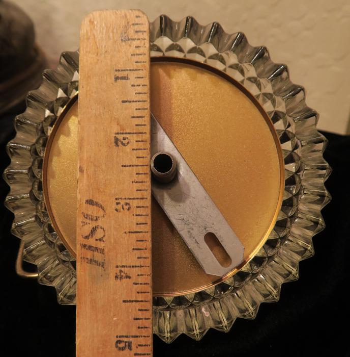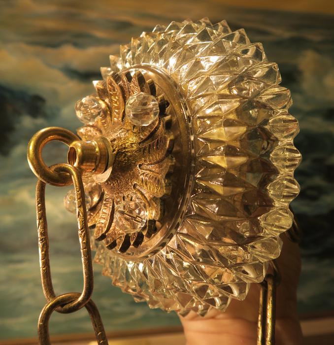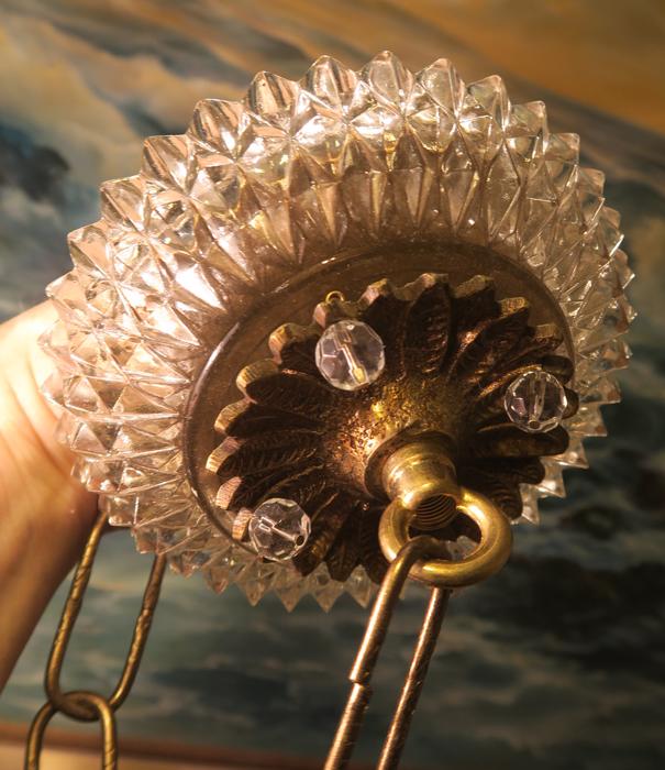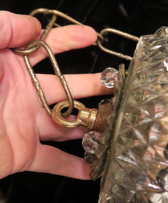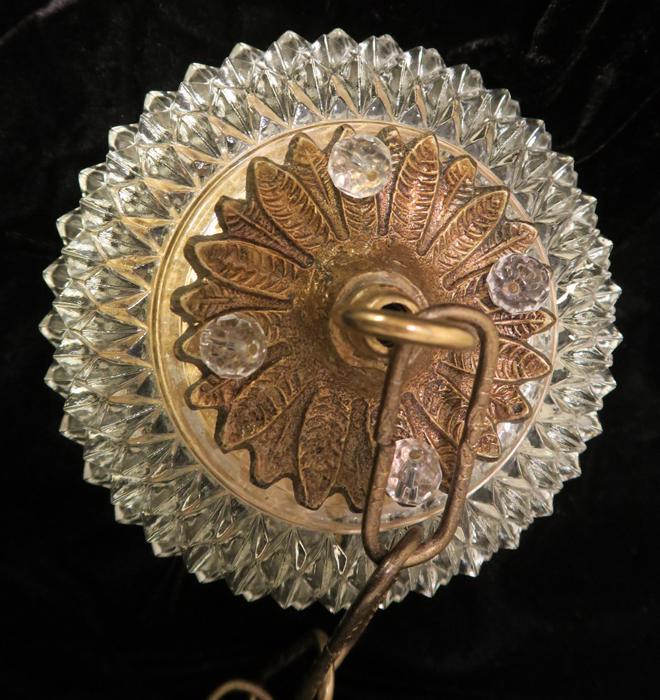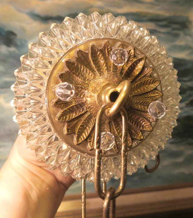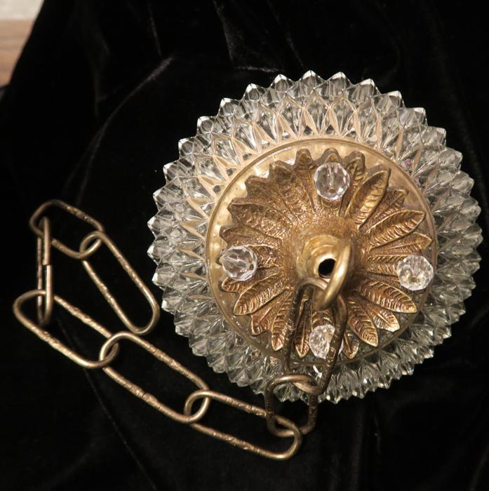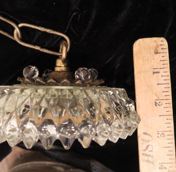 Please refer to the photos for the measurements**** the ornate chain Measures about 12.5" long. If a longer chain is needed - let me know. Brass and Tole metal ceiling cap with pressed crystal clear hobnail glass; Great condition - as shown - ready to use. Please see photos, they are part of description;