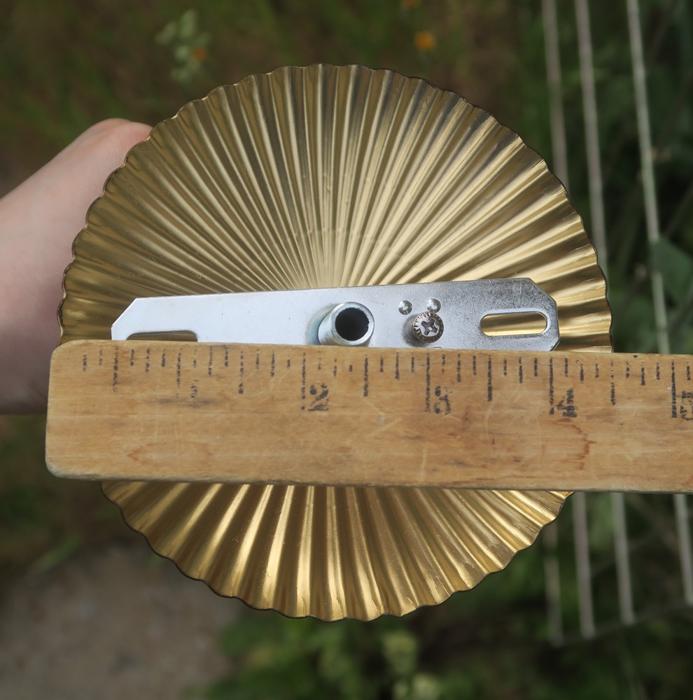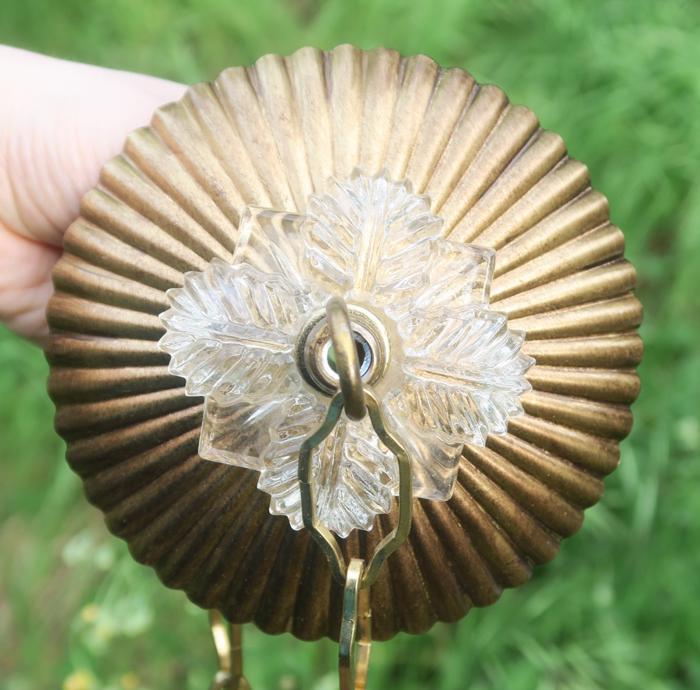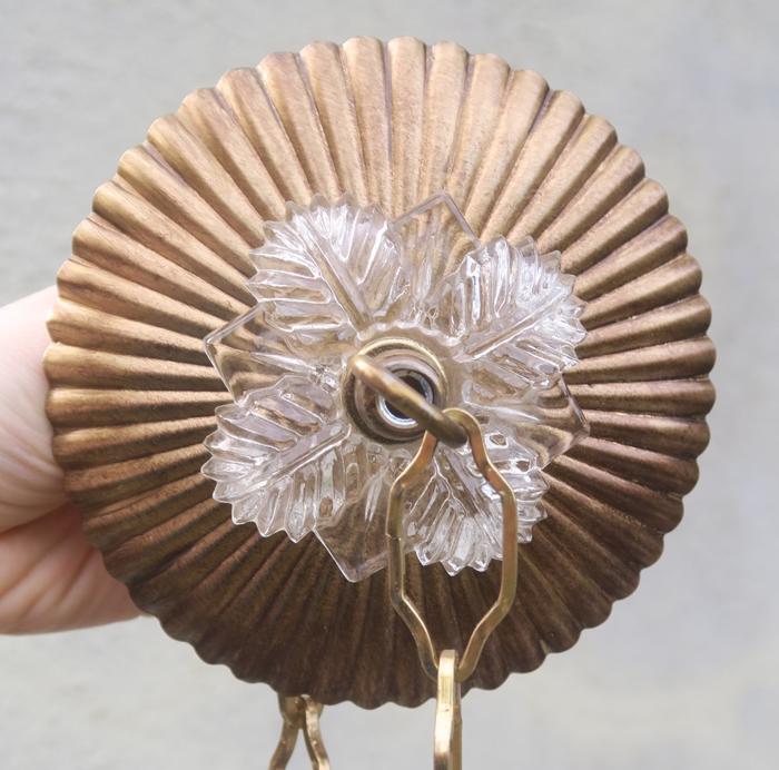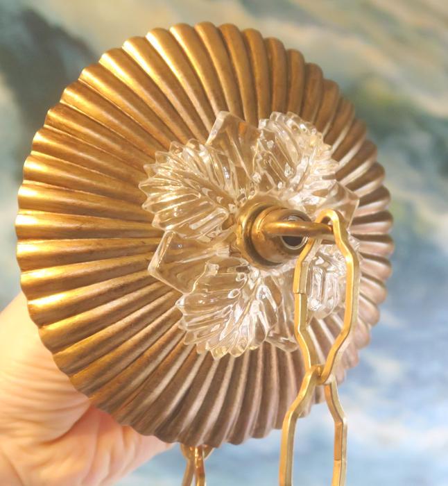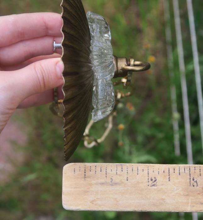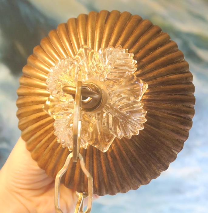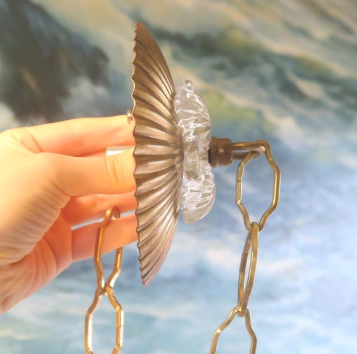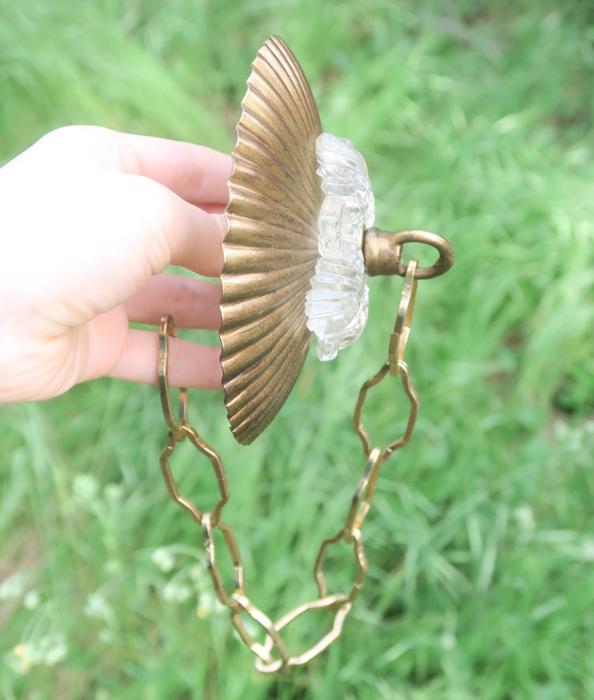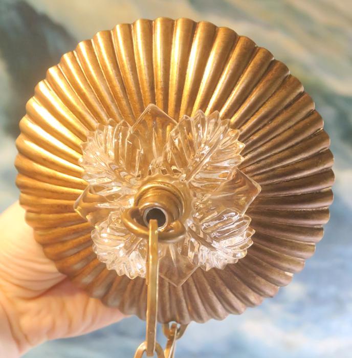 Old ribbed Fern glass Canopy ceiling part brass Vintage lamp chandelier with chainPlease refer to the photos for the measurements**** The canopy is 4.5" in diameter the ornate chain Measures about 12.5" long. If a longer chain is needed - let me know. Brass and Tole metal ceiling cap with Fern relief clear glass; Great, perfect condition of the glass no chips cracks or any problems - as shown - ready to use. The sale is for one set as shown. I do have multiples