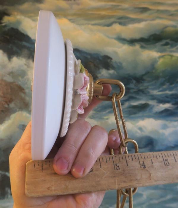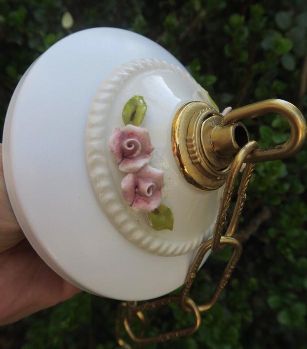 Please refer to the photos for the measurements**** the canopy is about 5" in diameter. the ornate chain Measures about 12.5" long. Porcelain with with relief rose designs; Great condition - as shown - ready to use- not marked, but is Italian Capodimonte Italy porcelain; Please see photos, they are part of description; the sale is for one set as shown.
