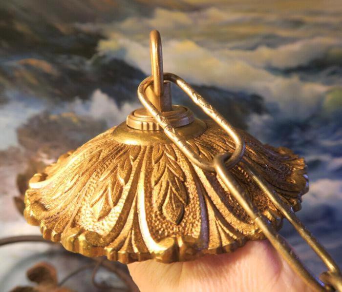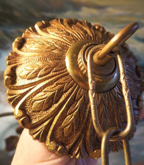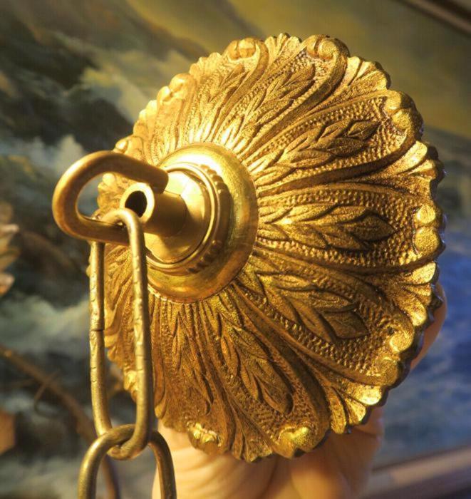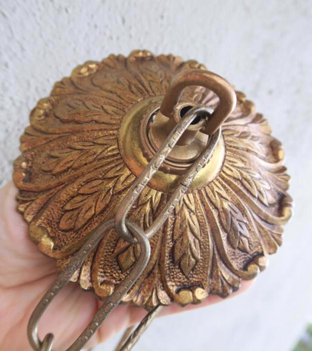 Please refer to the photos for the measurements**** measures 5" in diameter the ornate chain Measures about 12.5" long. (if a longer chain is needed- just let me know). Vintage heavy solid cast brass /bronze ceiling canopy with mounting hardware part set - a great part to use to hang your lamp or chandelier; the Canopy has an original finish with old patina look and very intricate ornate relief detailed casting. Good condition - as shown - ready to use- Please see photos, they are part of description