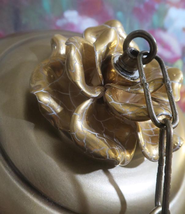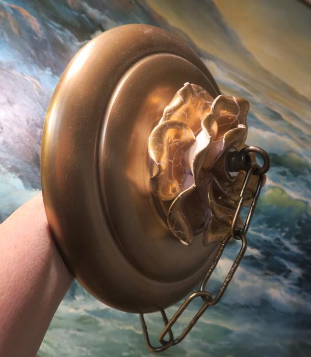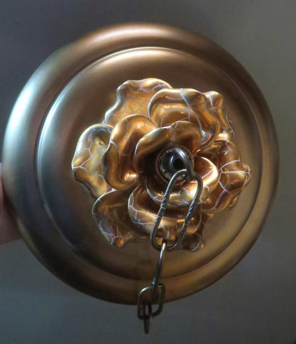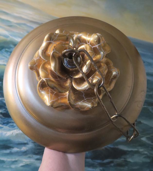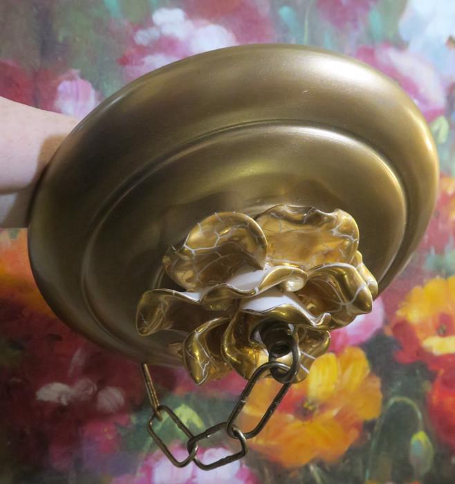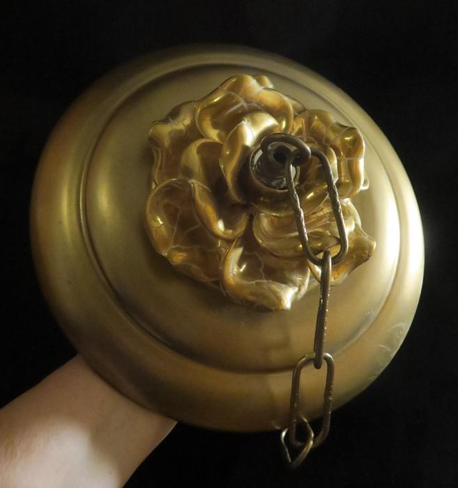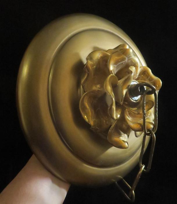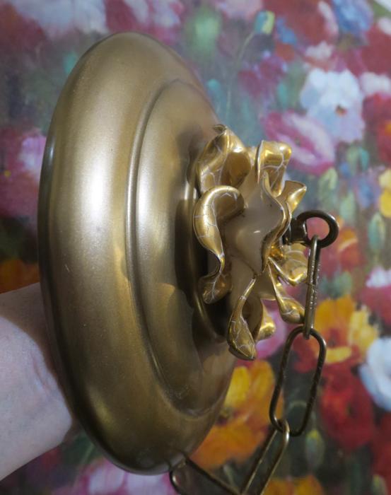 Vintage large 9" canopy from 1950s ~ Italian Tole Metal Ceiling cap canopy with chain hanging lamp chandelier part set. Very ornate, accented with relief porcelain Golden rose flowers crown and has a beautiful gold tone finish on the metal. Please refer to the photos for the measurements**** the Chain Measures about 12.5" long. (if a longer chain is needed, please let me know). Vintage ceiling cap canopy with mounting hardware part set - a great part to use to hang your lamp or chandelier;