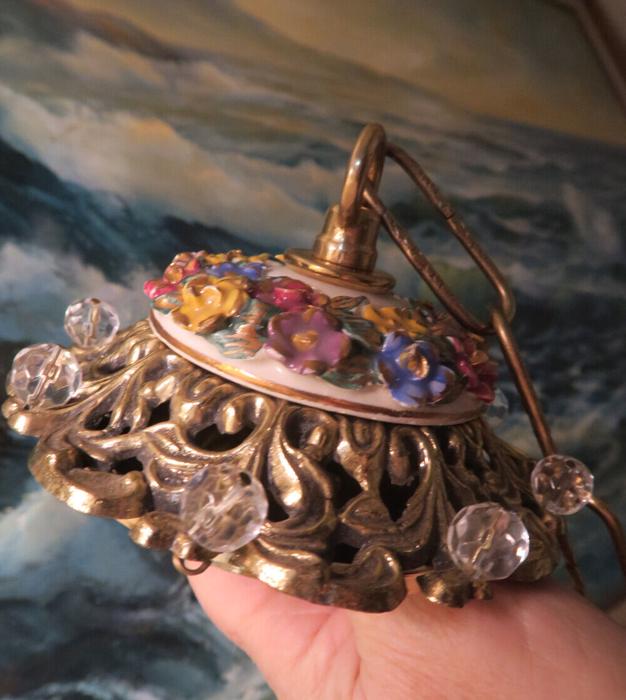 An old, Vintage Capodimonte porcelain canopy with gilt crown leaf spelter design lamp chandelier part with chain and hardware, ready to hang beaded with glass faceted beads Please refer to the photos for the measurements**** the ornate chain Measures about 12.5" long. Beautiful gilding with relief Barbola colorful rose floral designs; Great condition - as shown - ready to use- not marked, and is Italian Capodimonte Italy porcelain with bronze; Please see photos, they are part of description; the sale is for one set as shown.