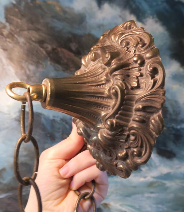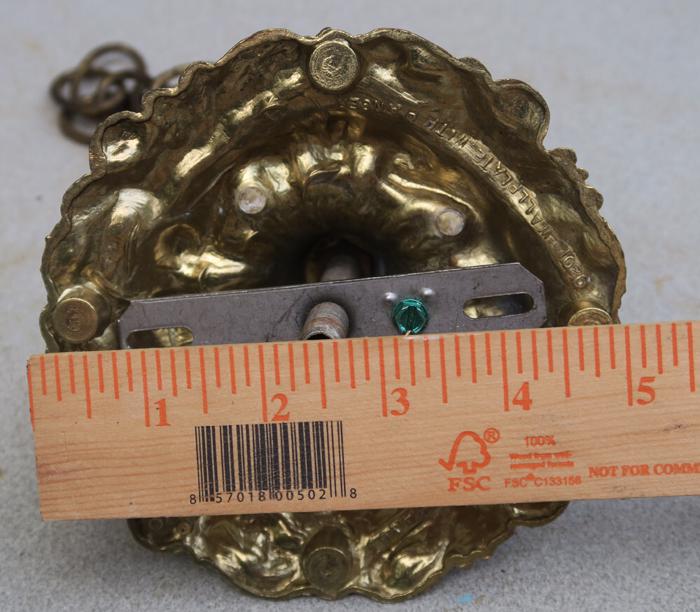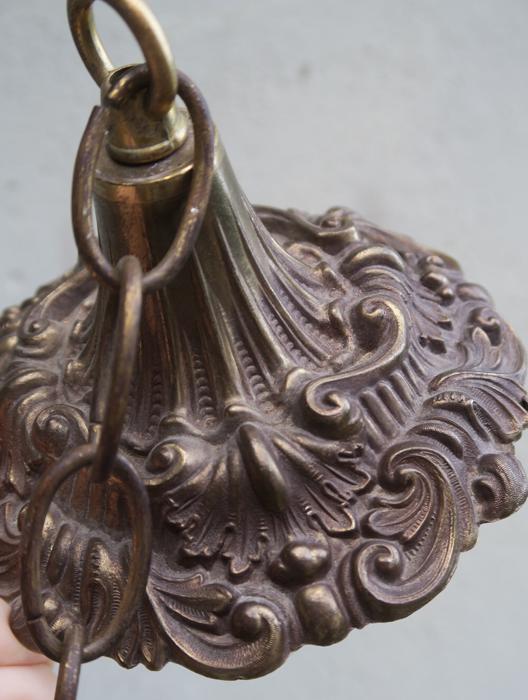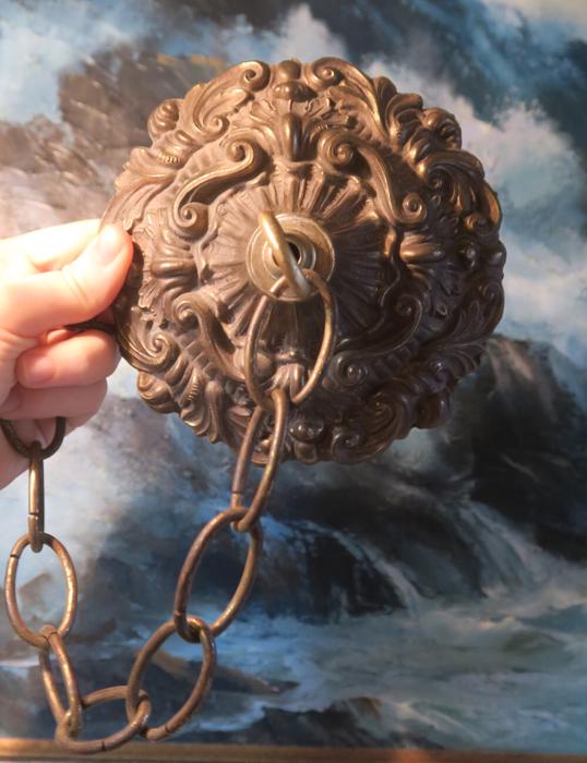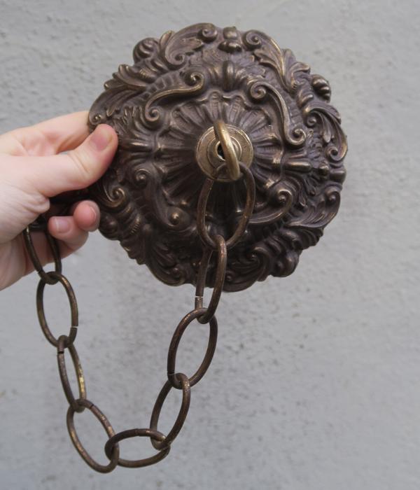 A ceiling canopy part Vintage Spelter brass gilt finish ornate 12.75" Chain hardware set Please refer to the photos for the measurements*** the ornate Chain Measures about 12.75" inches long. It has an ornate relief design; (if a longer chain is needed, let me know) Offered is this Vintage cast spelter metal with original gilt brass plated finish with great patina ceiling canopy with mounting hardware part set - a great part to use to hang your lamp or chandelier; Good condition, as shown - ready to use.