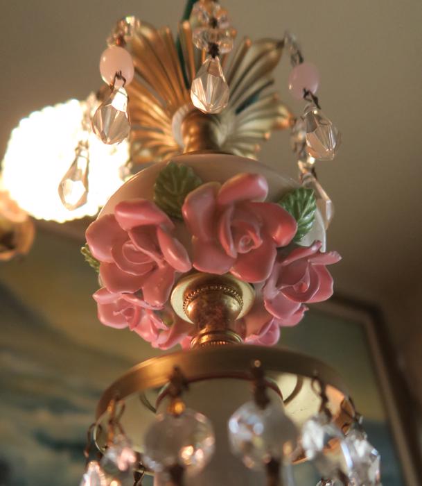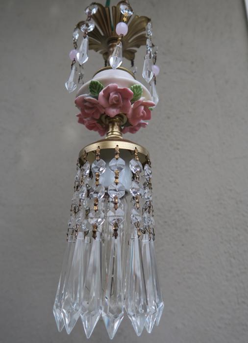 A beautiful small size hanging swag mini lamp; the metal is a combination of brass and tole metal painted gold tone. Relief Porcelain center with pastel colored pink Barbola roses. New wiring and porcelain socket; Great working order, large Icicle prisms that put out rainbow sparkle with shine! All prisms are in great condition, no missing or broken prisms. Porcelain in great condition. The sale is for one lamp as shown. However I do have a matching lamp like this listed with this auction - in case you are interested in a matching pair; Fixture uses a standard base size bulb - up to 150 watt . (not incl.) This lamp chandelier comes with an extra long 9' foot cord with switch and plug so you can hang it anywhere and plug into a wall outlet. Please see photos, they part of description. lamp measures 12" tall, 3.75" wide and comes with extra long 9 foot cord with switch and plug