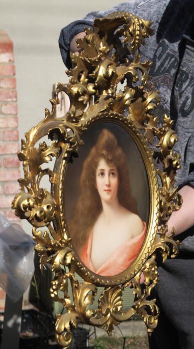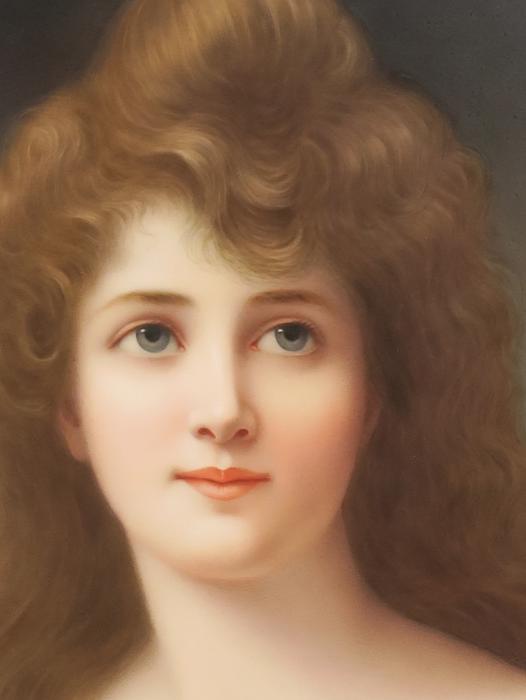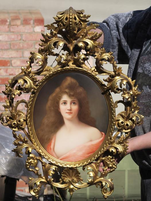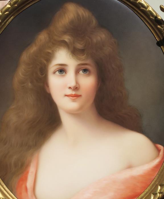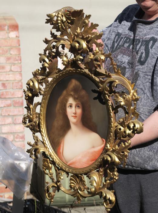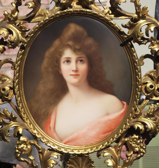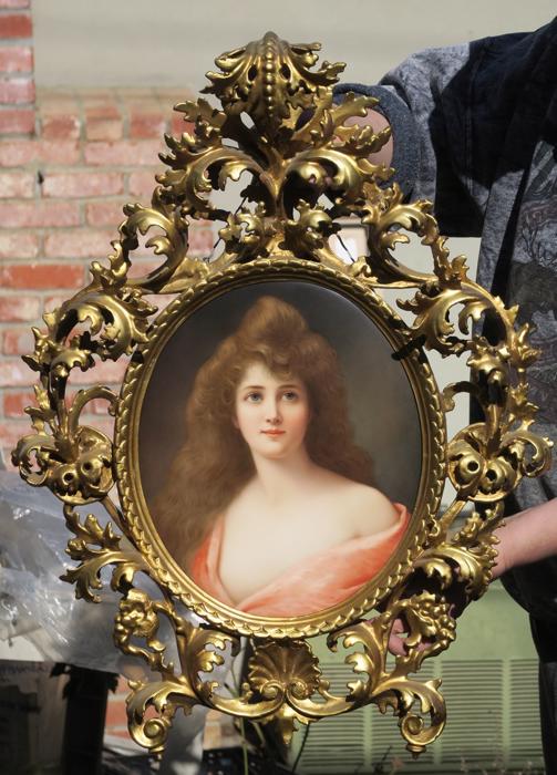 Large Antique KPM Porcelain Berlin plaque Florentine ROCOCO frame Asti Wagner Signed Antique KPM Berlin porcelain plaque set in carved ROCOCO gilt Florentine frame ~ Fully marked With KPM Scepter mark , 100% handpainted, excellent mint condition Signed: Wagner after Asti Subject: LaPence The painting after Angelo Asti Subject " La Pence" and is signed by Wagner in the right lower side. Depicts a long haired young girl wearing a sheer pink dress. She has a beautiful face with chestnut , wavy long hair with rose tiara in her hair. The plaque is marked KPM mark impressed on the back . The plaque is in absolutely perfect mint condition, no chips cracks or scratches; Please note that any white specs on the porcelain are dust or camera reflections. Beautiful gilt Rococo frame. Elaborate top design, very ornate throughout! the frame is in great condition with no missing pieces, gilt with reddish patina underneath Plaque alone measures 13.5" by 11" oval Framed: 28" by 21.5" Please see photos they are part of description, ask all an any questions before bidding. Shipping to US is via UPS ground insured, with signature confirmation service