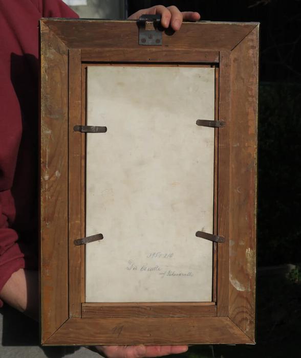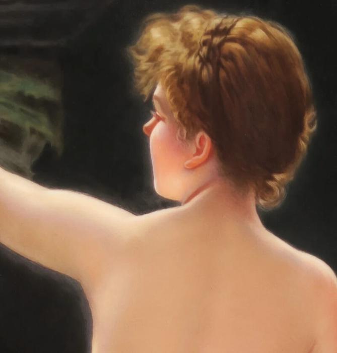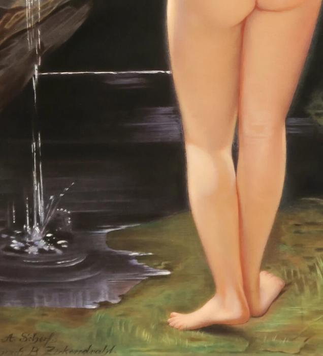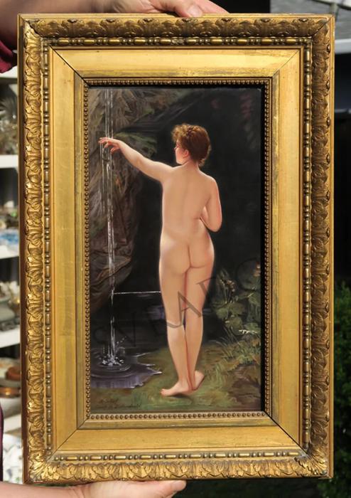 Large Oversized Antique KPM Berlin Art Nouveau porcelain plaque set in original period antique carved gilt wood frame~ signed, marked, 100% handpainted, excellent condition A BERLIN (K.P.M.) PORCELAIN RECTANGULAR PLAQUE, LATE 19TH/20TH CENTURY, IMPRESSED MONOGRAM AND SCEPTRE MARK, CYPHER, h. with size numbers SUBJECT: Nude bather at the waterfallSIGNED: A. Sherf after B. Zickendraht Offered this very large and very rare subject and top quality Painting on Porcelain KPM plaque. Absolutely Incredible in every way! The painting depicts a young, nude, bather girl standing at the waterfall near a forest cave. Incredible play of light and shadow, masterfully executed on the luminescent porcelain, to show the beauty of the human body--looks so realistic! Signed at the lower left corner. Great detail on this rare Art Nouveau Genre plaque; The plaque is fully marked on the back with impressed KPM and scepter and numbers inceased into the porcelain - see photos for more details.The plaque is in Absolutely Perfect Mint Condition, no chips cracks or scratches or any flaws what-so-ever; The plaque is set in an original period, carved wood frame, which has all original gilding that is all intact and in absolutely great antique condition with dark patina; This unique frame has very relief carved designs throughout with elaborate top design. The frame is in great condition with great age showing. Measures framed 20.5" by 14.5" and plaque is about 15.5" by 8.5" Please see photos they are part of description