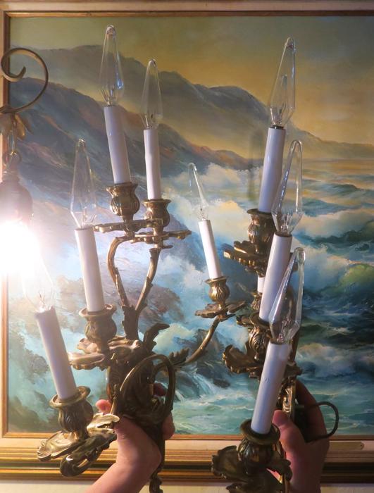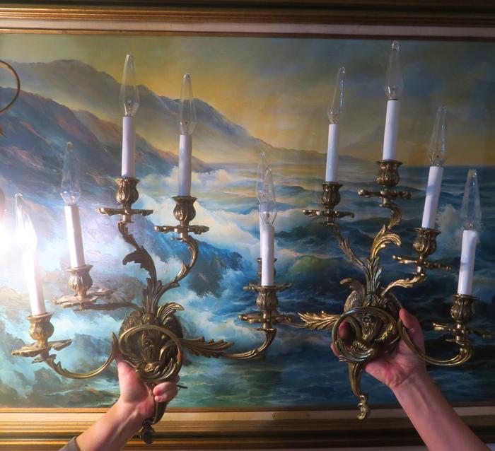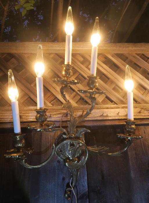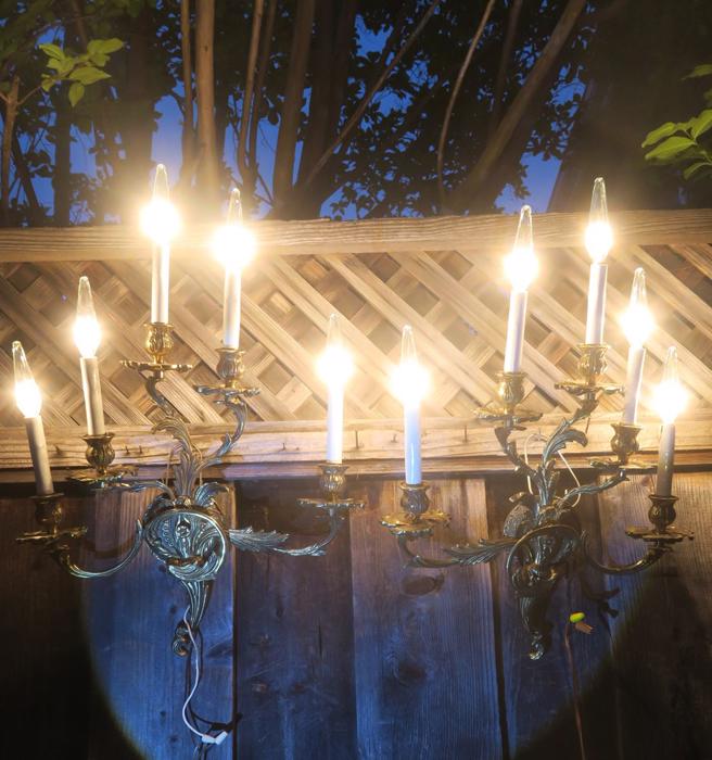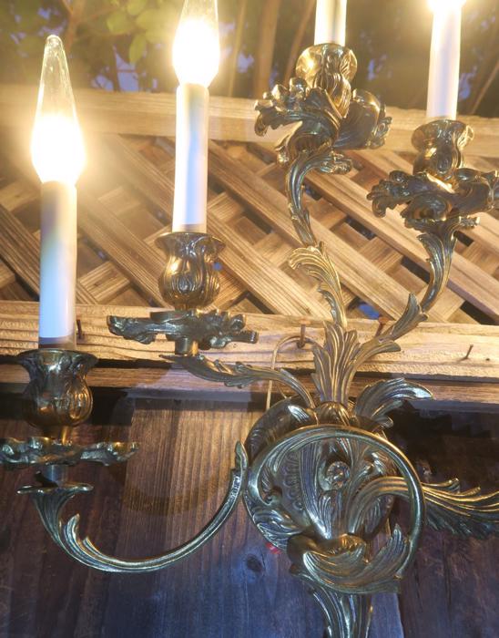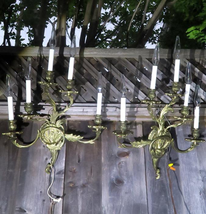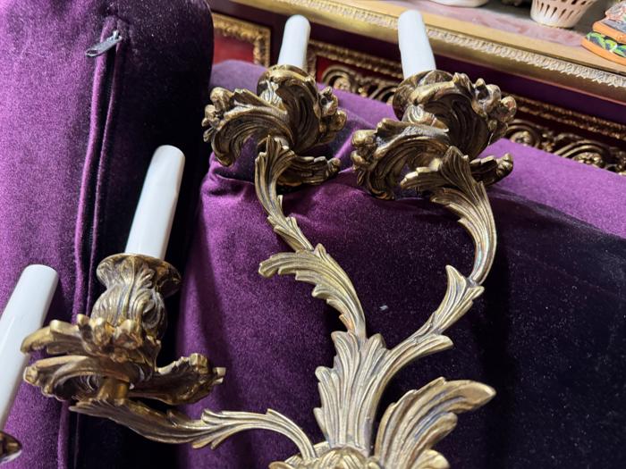 Great PAIR of top quality Large Dramatic gilt bronze old French Rococo Inspired ornate 5-light Sconces; Acanthus leafs ~ wall chandeliers ~ Accent lights~ Marked SWEDEN A beautiful pair of Rococo Era Inspired design great quality Sconces- old vintage. The metal is gilt Bronze with original shiny gilt finish, still shiny with old charming patina. Intricate design with acanthus leafs and buds on the arms and very elaborate back plates with ornate open arms with candlesticks designs. Each sconce is a 5 light fixture. Great working order ready for hanging in your home. These sconces have to be wired into a wall - as these are wall fixtures and come with mounting hardware; I believe these vintage sconces would date somewhere from 1930-1940-s. These are European sconces, Marked Made in Sweden. Sconces use small base chandelier bulbs - 10 of them up to 25watt each (Not incl). The sale is for a pair. No broken or chipped pieces, all intact. Please see photos, they part of description!These measure total up to the candle sleeves (without the bulbs) about 21" inches tall, 17.5" inches wide by about 3.75" deep; back-plate measures about 4.25" round