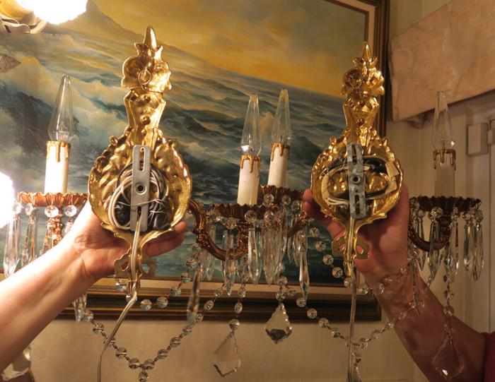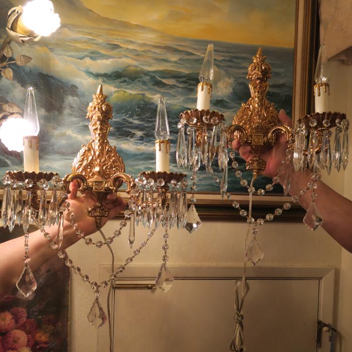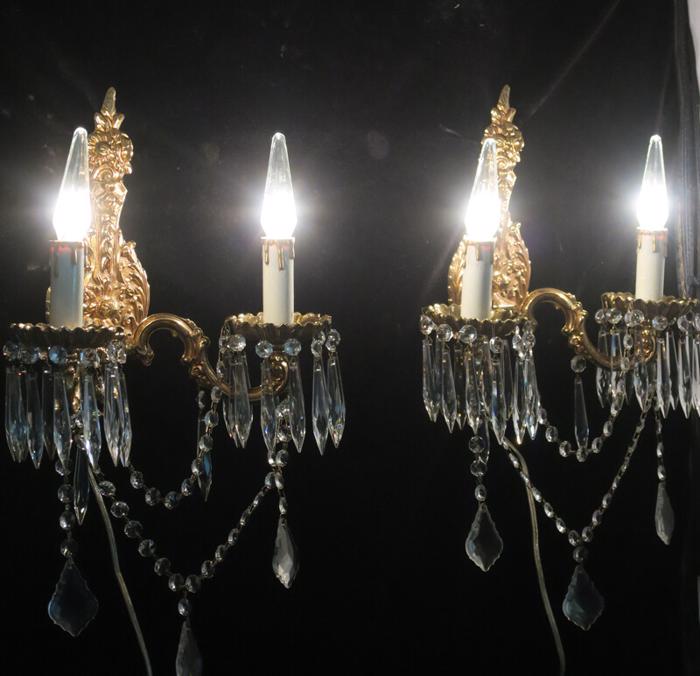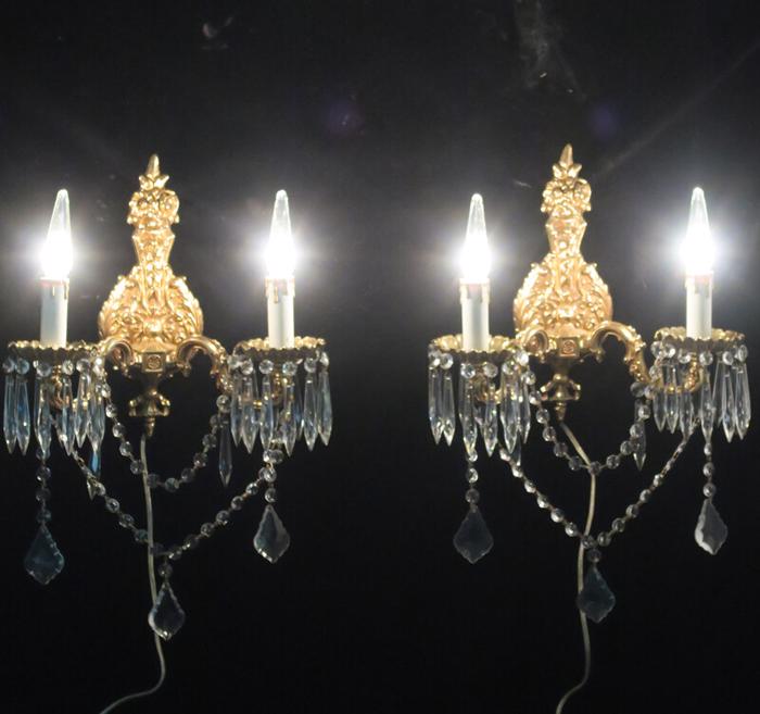 A beautiful pair of Sconces with Crystal Prisms and garland swags. The metal is Bronze (or it may be cast brass) with beautiful gilt plated finish and old charming patina. Beautiful design with relief Rose top flur-de-lis leafs and flower buds. Beautiful when lit. Each sconce is a 2 light fixture. Great working order ready for hanging in your home. The sconces can be wired into a wall - as these are wall fixtures and come with mounting hardware; or, cords with switches can be added to plug in these into an outlet and hang anywhere in the room. I believe these vintage sconces would date somewhere from 1940-1950-s. These are European sconces, French Rococo style. Sconces use small base chandelier bulbs - 4 of them up to 75watt each (not incl.); The sale is for a pair. Great working condition ready to install. No broken or chipped crystals. Please see photos, they part of description! measure total with crystals about 17.25" tall, 12.75" wide and about 6" deep