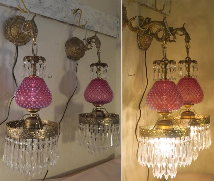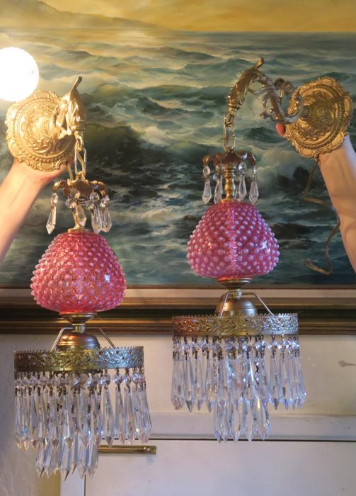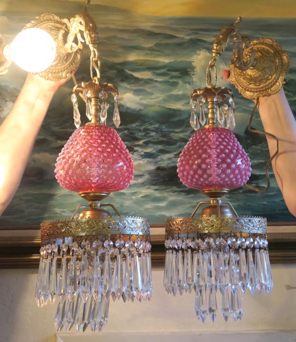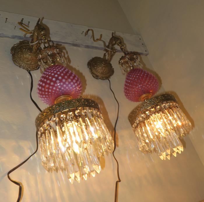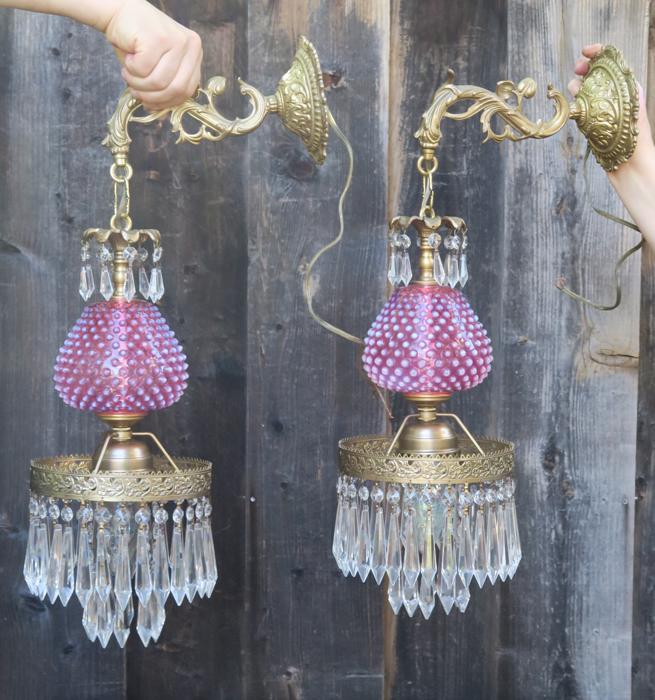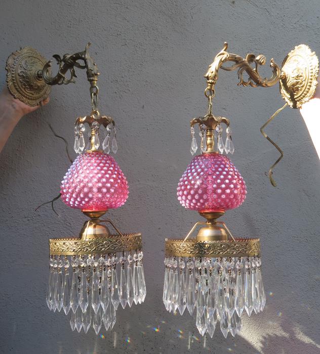 A Pair of large hanging vintage Sconces Lamps with Tiers of European Crystal Prisms! Fenton Cranberry Hobnail Opalescent Glass ~Nouveau Style ~ Tons of Crystal Prisms cascading in tiers! Beautiful vintage Unique pair of sconces-dripping with Sparkling , Glitzy .... European French U-drop Crystal Prisms. Large size Fenton Cranberry hobnail Opalescent Glass. Delicate ornate bronze leaf bobeche at the top with tear drop clear crystal prisms. The metal is bronze or brass, and some toleware pierced gold metal on the ring with very ornate designs. Very unique design with tiers and tiers of Cascading French U-drop Clear crystal prisms. These light fixtures take a standard base size bulbs (not incl). - each takes one bulb. These are wall fixtures and sconces can be wired into a wall or, cords with switches can be added to them to plug these into an outlet and hang anywhere in the room. Great working order ready for hanging in your home. New wiring. The sale is for a pair (2 sconces); These unique lights will compliment any home decor. No missing, cracked broken pieces. All prisms and Fenton glass are intact, no chips, cracks etc. Each sconce total measures about 19.25" tall and 7" wide and 10" deep (Fenton cranberry glass measures about 5" tall and 4.75" wide)