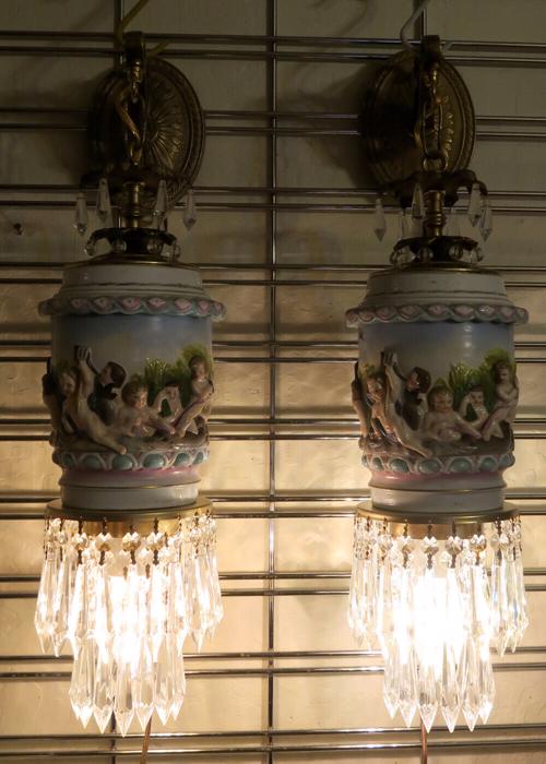 A unique pair of wall sconces Accent light ~ very ELEGANT and CLASSY wall lights. The metal is brass or bronze, very ornate with massive back plates and arms. Beautiful lanterns with cascading tiers of Crystal clear prisms; Relief Porcelain with Sea cherub scenes, serpents and Poseidon Nautical theme and in absolutely great condition, These have been fully rewired, the mark is shown on the photos, can't make out, most likely Dresden or Sitzendorf; these are wall fixtures and come with mounting hardware ready to install; Please see the photos for more details - they are part of description. This sale is for the PAIR. Great, fully working condition with No missing, cracked broken pieces or prisms these sconces total measure 24" tall by 6" at the widest point; and 9.5" deep