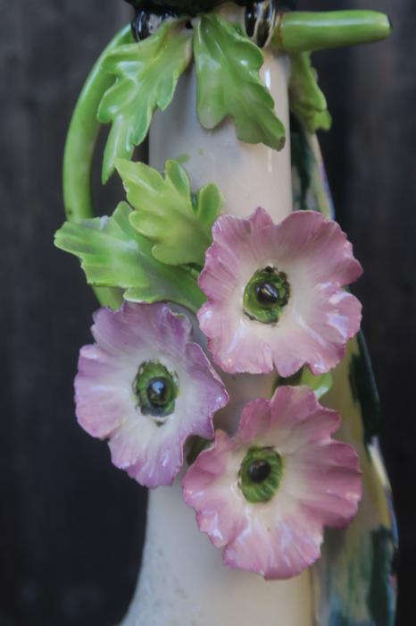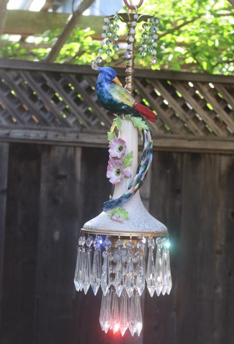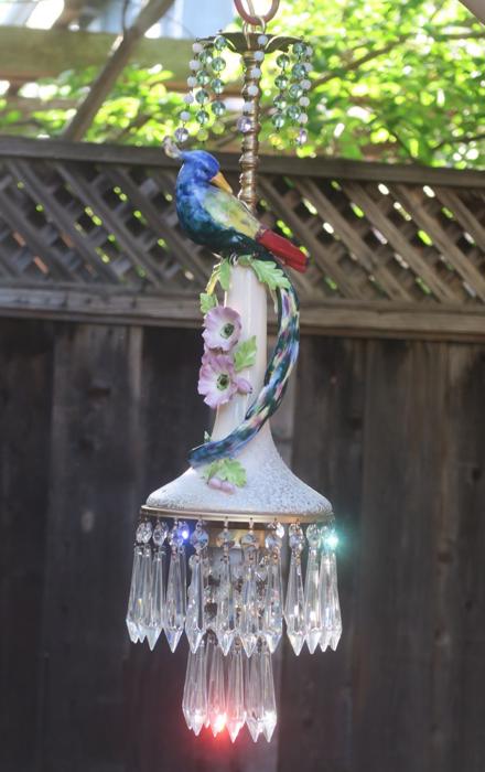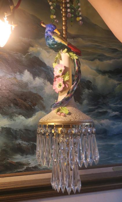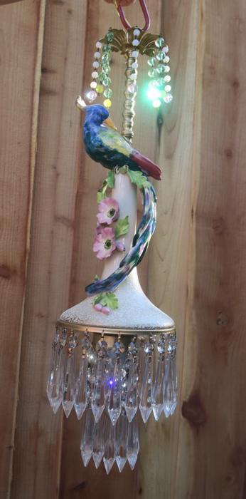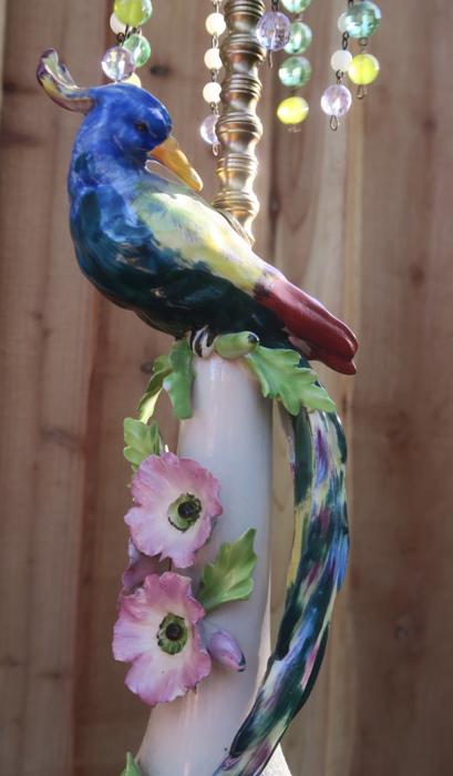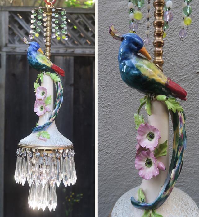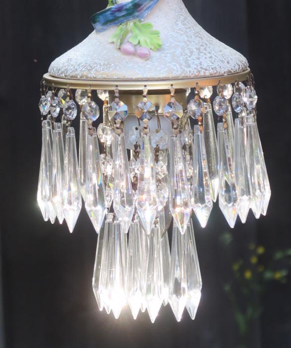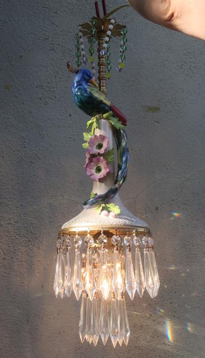 Large Paradise Bird Swag plugin Chandelier, with crystals with opaline beads cascade opaline macaroni bead garlands Unique! Lavender flowersThere is one porcelain Paradise bird with wings and a long tail in the center. Two tiers of large Icicle prisms around the bottom of the fixture; Fountain of dripping beads and crystals at the top bobeche. The metal on this lamp is a combination of brass and tole metal painted gold tone. The chandelier is a 1 light fixture, that takes a standard base size bulb up to 150 watt (not incl). New wiring and porcelain socket; It is a swag plugin fixture, comes with 9' foot long cord with switch in line and plug at the end and you can hang it anywhere in the room and plug into a wall outlet. The sale is for one fixture only - as shown. Fully working condition; All prisms are intact, no chips, cracks etc. total measures about 22" tall x 6.5" at the widest point