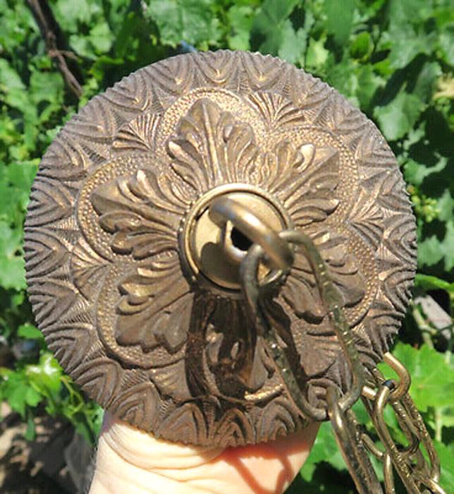Vintage cast Brass Bronze Ceiling cap canopy chain hanging lamp chandelier part set, beaded Acanthus leaf design Please refer to the photos for the measurements****Measures a little under 4.75" in diameter, the ornate chain measures about 12.5" long. (if a longer chain is needed- just let me know). Vintage heavy solid cast brass /bronze ceiling cap canopy with mounting hardware part set - a great part to use to hang your lamp or chandelier; the Canopy has an original gilt finish with dark patina from age and very intricate ornate design with acanthus leafs relief detailed casting. Great condition - ready to use- Please see photos, they are part of description;