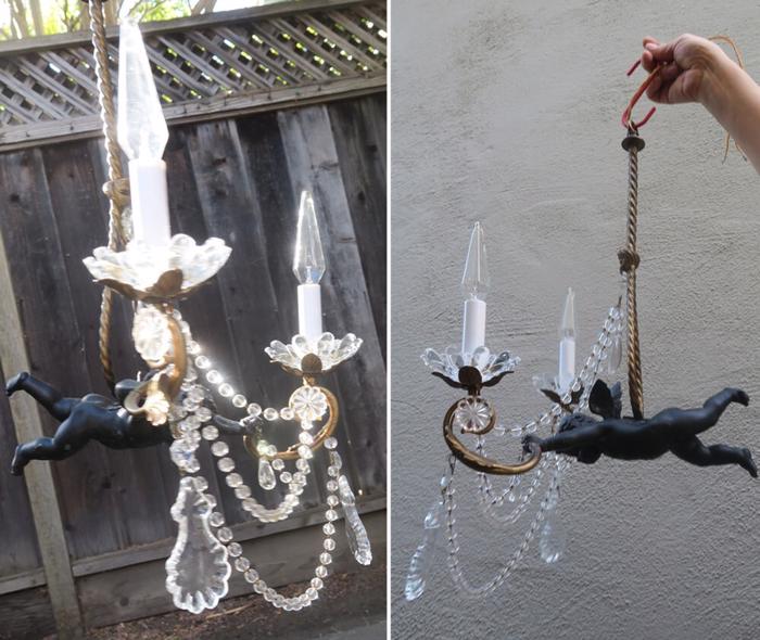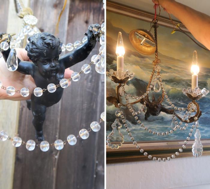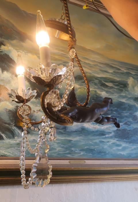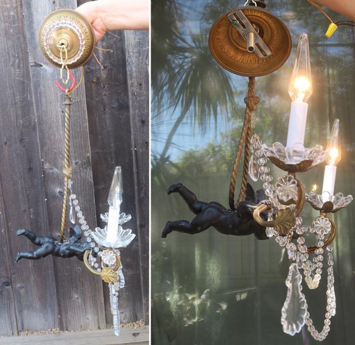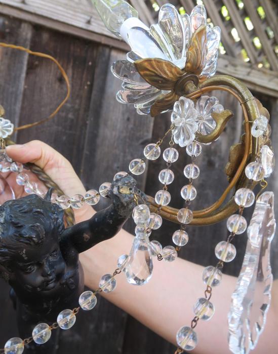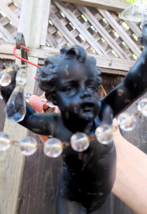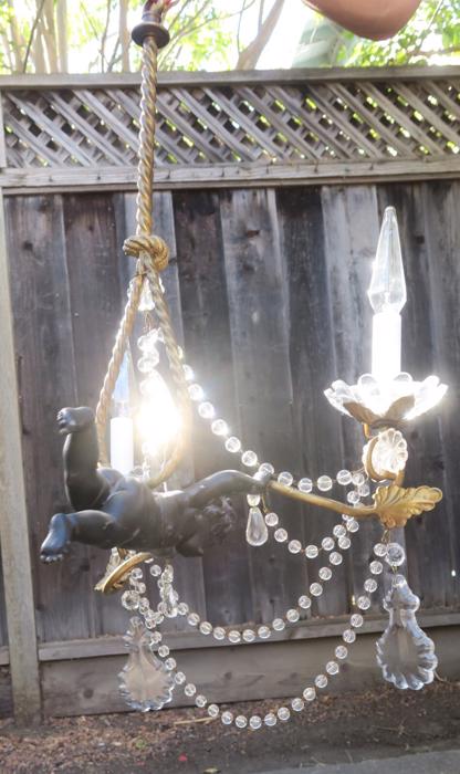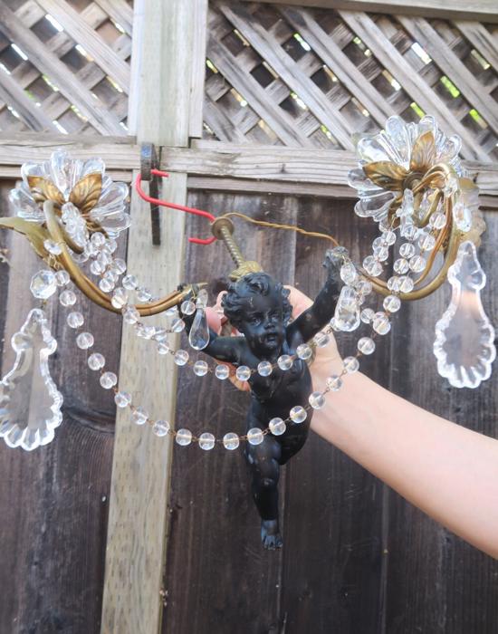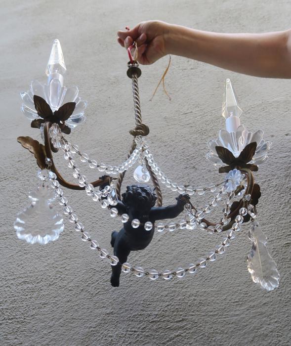 An adorable Antique Chandelier French Italy Lamp with Flying Cherub Brass bronze Crystal 2-lite ceiling light; Adorned with beaded Dripping smooth glass garlands and Crystal prisms Great accent light! Original gildingA unique hanging French CHERUB putti chandelier-hanging ceiling lighting fixture. The cherub is made of spelter metal with original polychrome finish and great old patina. Holding leafed branches with lights in his hands with buds and ornate bobeches. This hanging fixture takes a small base chandelier size bulbs - 2 of them up to 45 watt each (not incl). This is a two-light fixture. Ready to install in your home; A Very Unique Accent light fixture! Fully working condition; No missing, cracked broken pieces. All prisms are intact, no missing crystals, no chips, cracks etc.The chandelier total with crystals and swags measures about 24" tall x 14.5" at the widest point and 13" deep; Cherub sculpture itself measures 9.5" tall y 5" at the widest point