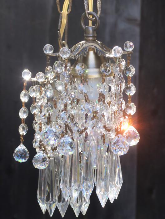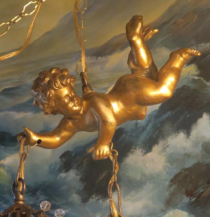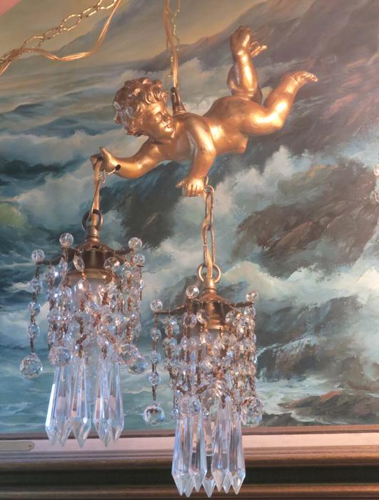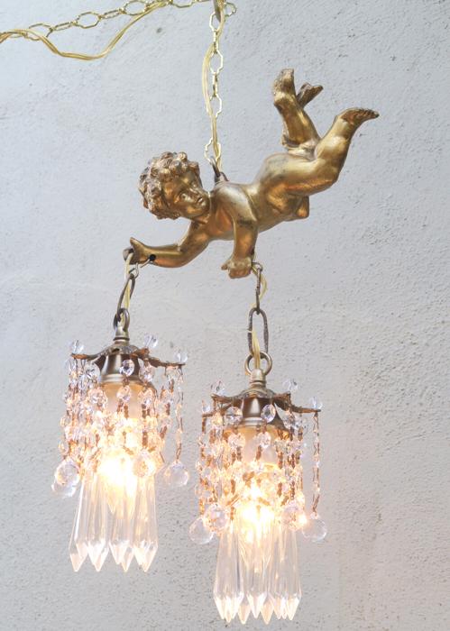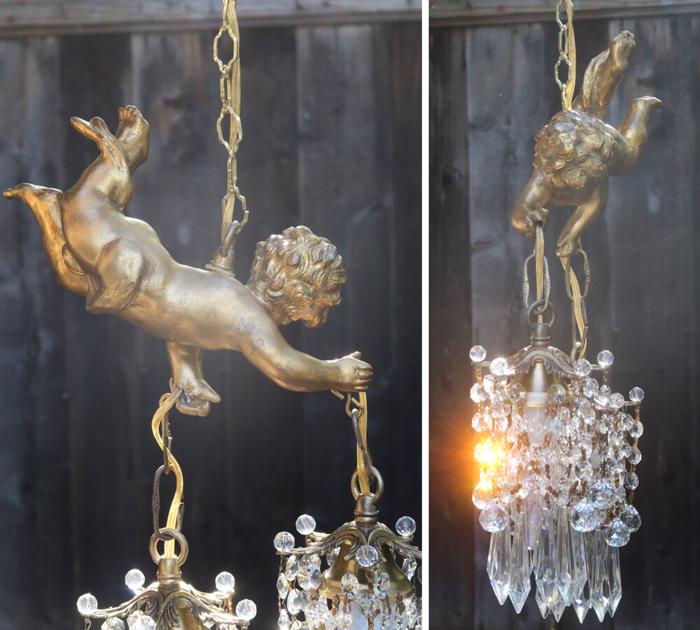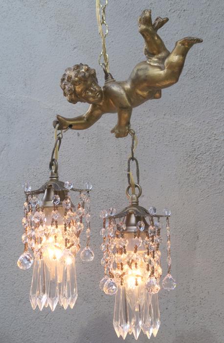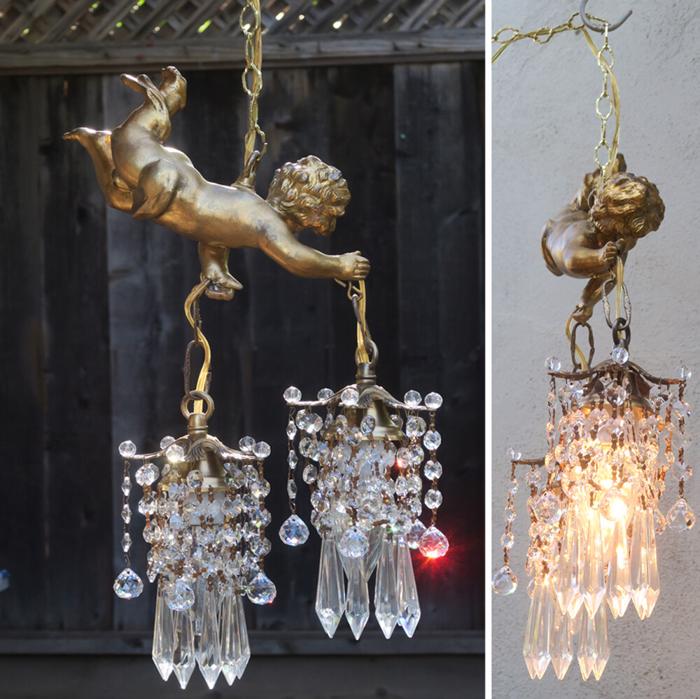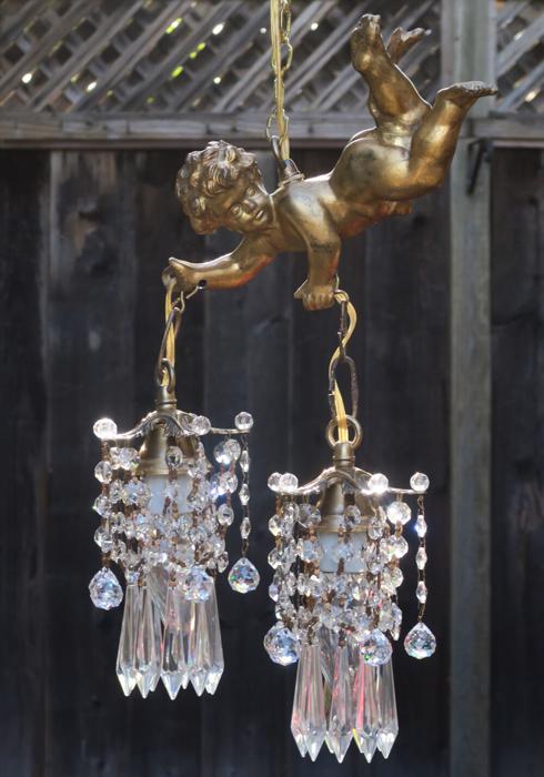 An adorable Vintage Chandelier French Italy Lamp Flying Cherub Tole Brass Crystal 2-lite swag plugin fixture; beaded lanterns with Dripping Crystal prisms Great accent light! Original gilding~ NEW WIRING!Offered this Beautiful hanging gilt Florentine Italian CHERUB putti chandelier-hanging ceiling lighting fixture Swag Plugin chandelier. Amazingly beautiful adorned with dripping clear crystal prisms and Sparkly cut crystal balls. The cherub which is made of toleware meta with original gilding gilt leafed Florentine surface is holding two lily flower shaped lanterns with dripping prisms in his hands. The light is in shape of a lantern with cascading tiers and tiers of French U-drop prisms and crystal ball accents. This hanging fixture takes a standard size bulb - 2 of them up to 150 watt each (not incl). This is a two-light fixture. Ready to hang in your home; Comes with a 9 foot long cord with switch in line and plug at the end and a chain lacing thru the cord- ready to hang in your home; It can be easily used as a ceiling fixture if a canopy added to it. A Very Unique Accent light fixture! Fully working condition; No missing, cracked broken pieces. All prisms are intact, no missing crystals, no chips, cracks etc.The chandelier total measures about 19" tall x 10" at the widest point ; Cherub sculpture itself measures 10.25" at the widest point