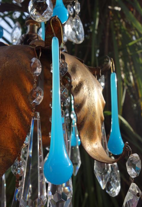 A beautiful vintage Italian Aqua Blue Crystal hanging lamp pendant light chandelier. Gilt gold leaf Toleware metal. Original gilding bright and shiny with old patina. Amazingly beautiful with gilt metal adorned with dripping Aqua Blue turquoise prisms, and clear tear drop crystals with large Icicle rainbow clear long prisms. Luscious Scrolling Lily flower design with leafs and ornate detailing. A True work of Art on this metal sculpture! Great working order, in great condition, Comes with ceiling cap and mounting hardware and some chain links and is a ceiling fixture. All prisms and Art glass drops are in great condition, no missing or broken prisms. Please see photos, they part of description. This is Italian Florentine lamp; unmarked. The sale is for one lamp only. The lamp is a 1 light fixture. It uses a standard base chandelier size bulb up to 150 watt (not included). NEW wiring and socket, ready to hang in your home. total with prisms the lamp measures 13" tall by 10" wide;