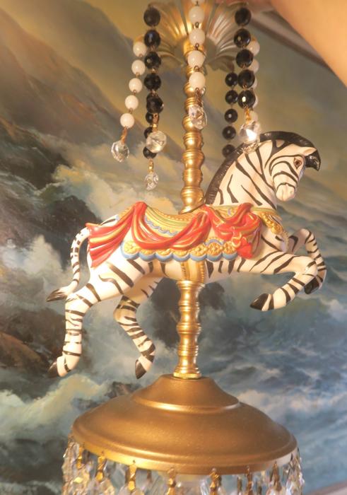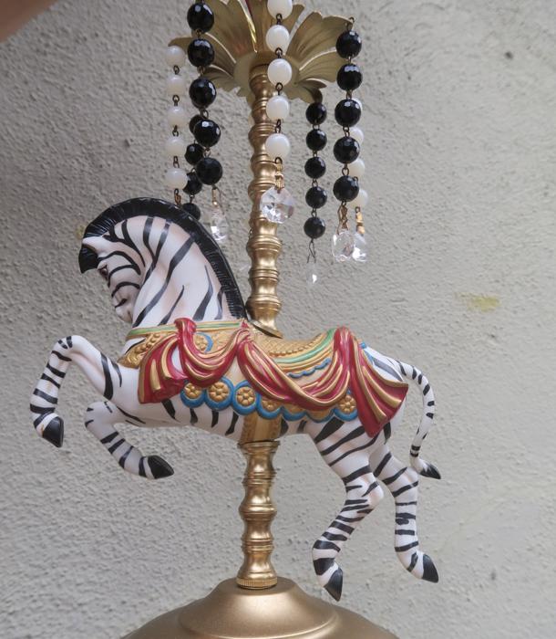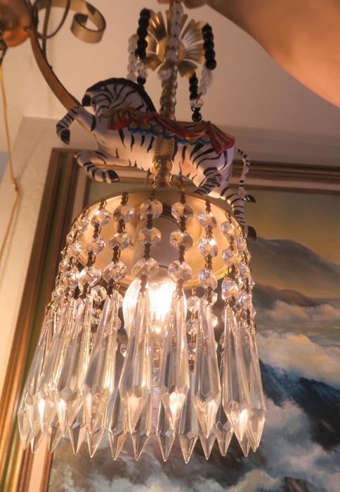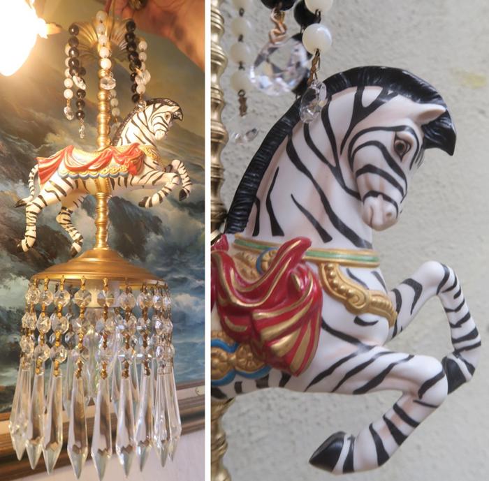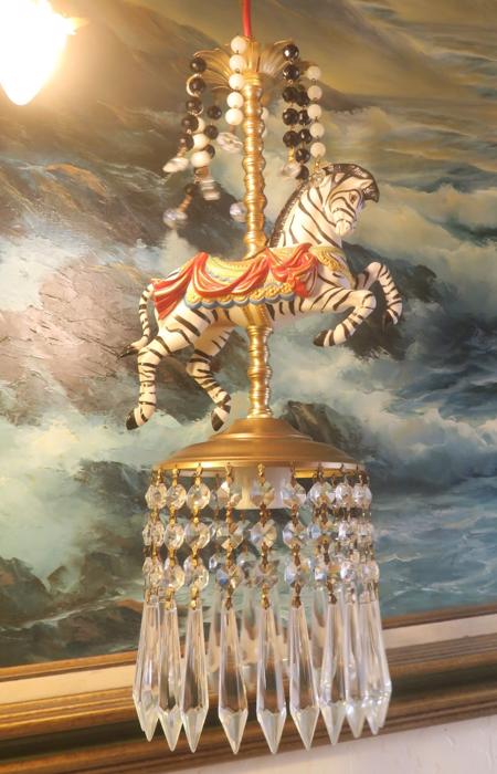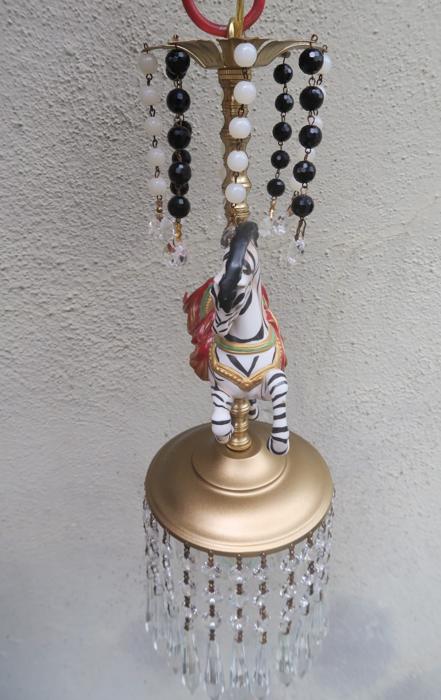 Zebra Porcelain Carousel Lamp Ceiling mount Chandelier Vintage opaline white and black bead strands, Sparkling Crystal prismsA beautiful absolutely porcelain Zebra chandelier-dripping with Sparkling European clear Crystal Prisms. Jeweled porcelain zebra with relief gilt enameled designs on the post. Dripping crystals at the top bobeche along with clear crystal prisms and glass bead garland strands; The metal is a combination of tole painted gold tone and cast brass. This is a one-light fixture that takes a standard base bulb (not incl.) New wiring, has a loop at the top and - is a ceiling mount install fixture that comes with 35" inch long cord with ceiling canopy with mounting hardware and is ready to install in your home. The sale is for one fixture only - as shown. I do have multiples. Fully working condition; porcelain zebra in great condition; All prisms are intact, no chips, cracks etc.total measures 17.5" tall by 7.5" wide