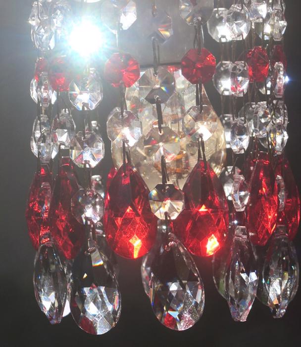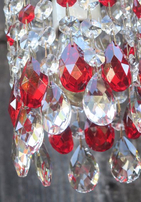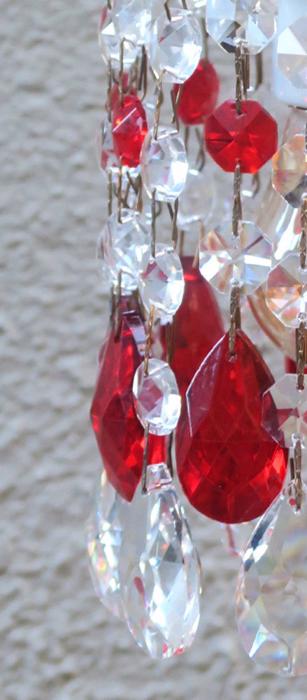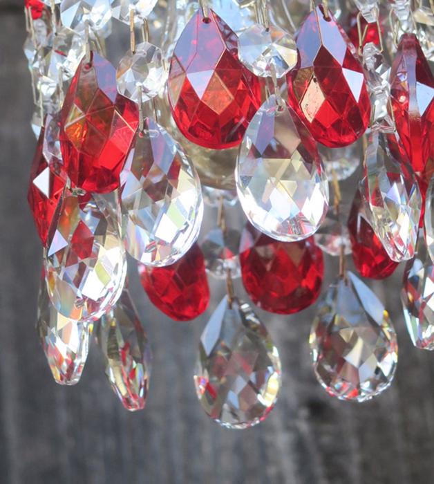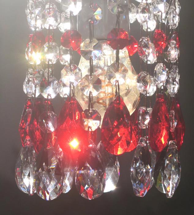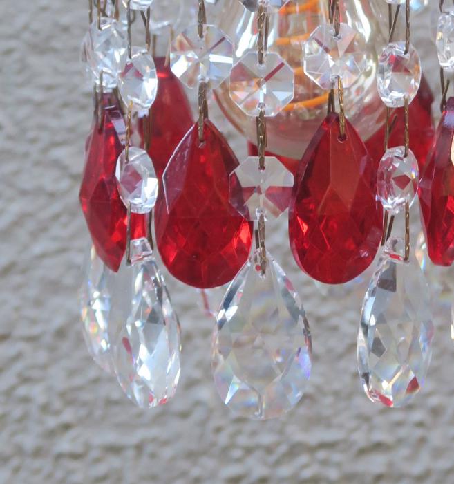12 Ruby red and Clear glass Crystal Prism Lamp Chandelier Part suncatcher design set.This lot of 12 tear drop almond pendant shaped prisms; each prism measures total with top octagonal piece and the bottom tear drop prism alone is 1.5" inches tall; and is a bit under 1" wide, each octagonal prism is 14mm wide; The prisms are in great condition, no chips or cracks; The sale is for 12 prisms where - 6 of prisms consist of 2 parts - the larger tear drop prism with octagonal small prism above it - and other 6 of prisms consist of 3 parts - the larger tear drop prism with 2 octagonal small prism above itand you get total 12 of these with this sale; Please note that the clear glass bobeche plate the dangles hang on and socket with bulb is not a part of this sale