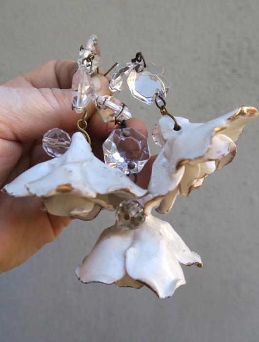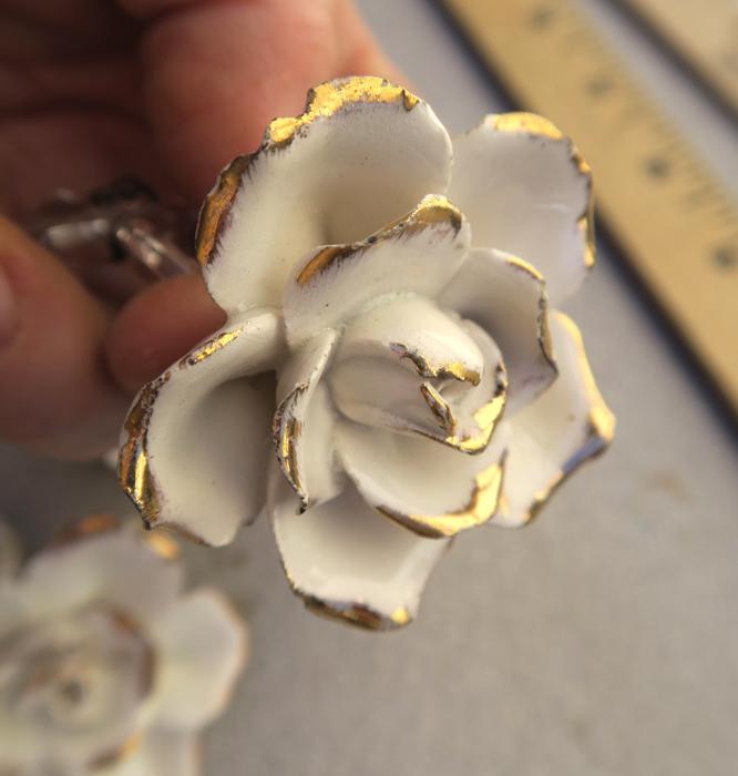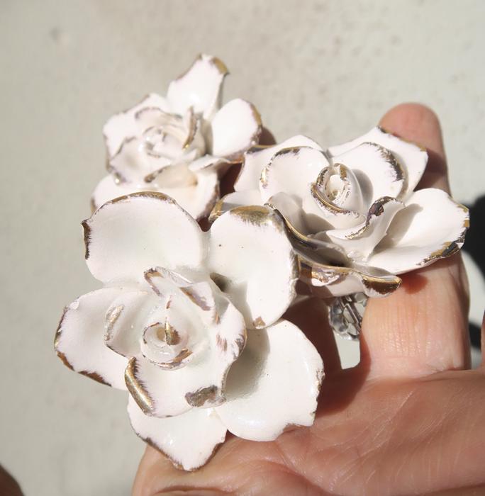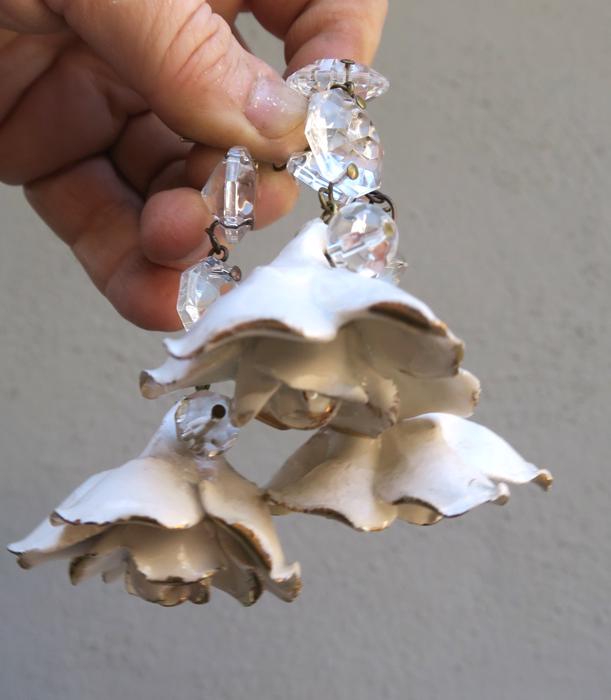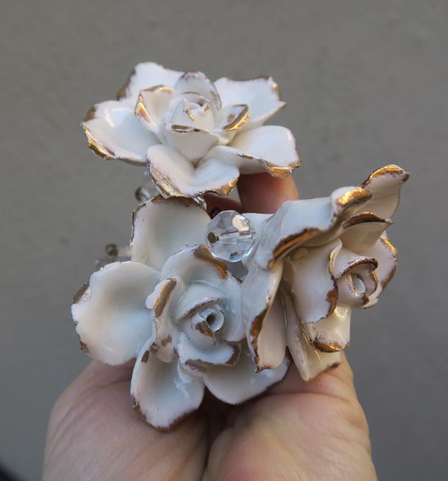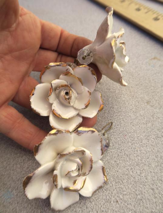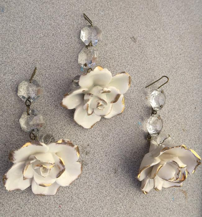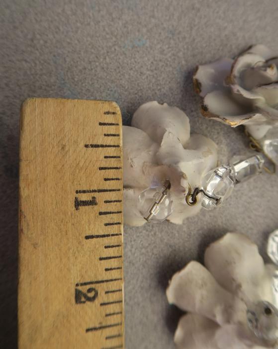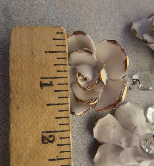 Please refer to the photos for the measurements***Offering this 2 Beautiful vintage porcelain Capodimonte White relief rose with gold highlights Crystal hanging Prism finial; Some nicks and scuffs may be seen on porcelain glazing common for old porcelain flower. Each prism has a bead strand on it with octagon crystal prism above the flower; The sale is for 2 rose prisms as shown