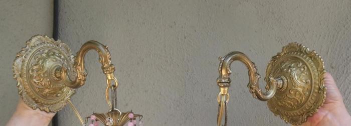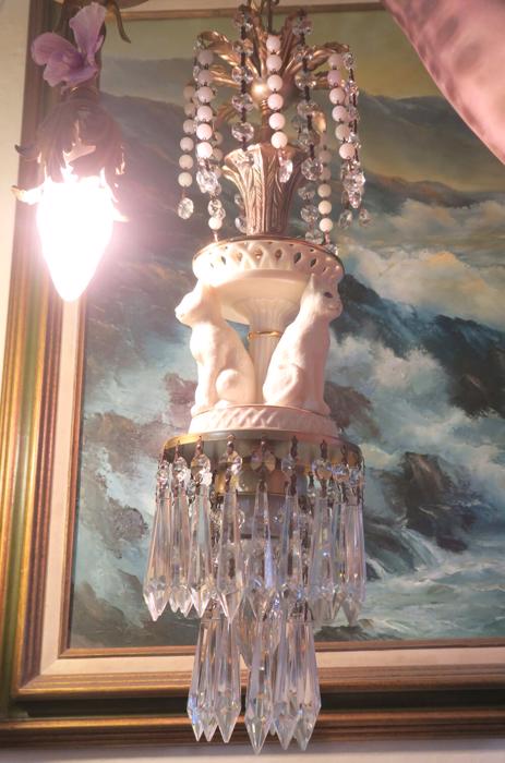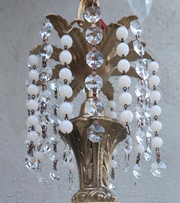 2 vintage Sconces brass & Tole metal with porcelain Royal White Kitty cat hanging lantern lamps, Opaline rose white bead garland strands ~New wiring~~With relief hand painted Porcelain White Royal Kitty posts all handpainted porcelain with pierced crown designs~ Leaf top crown design with dripping clear crystal prisms and bead strands.The metal is a combination of brass/bronze and tole metal painted gold tone. A crown leaf top above each lantern it with macaroni opaline white beads garlands, and sparkly crystal strands; New wiring and porcelain sockets; Great working order, large clear Icicle prisms at the bottom layers that put out rainbow sparkle with shine! All prisms are in great condition, no missing or broken prisms. Porcelain in great condition so are the beads. The sale is for 2 sconces - as shown. These can be installed into the wall -- Or (Cords with switches can be added to them to hang them anywhere in the room and plug into a wall outlet;) Fixtures use a standard base size bulb - up to 150 watt each. (not incl.) Please see photos, they part of description.The sconces measure total with prisms about 23.5" tall by 7" at the widest point and 9.5" deep. The back plates are 5.25" in diameter