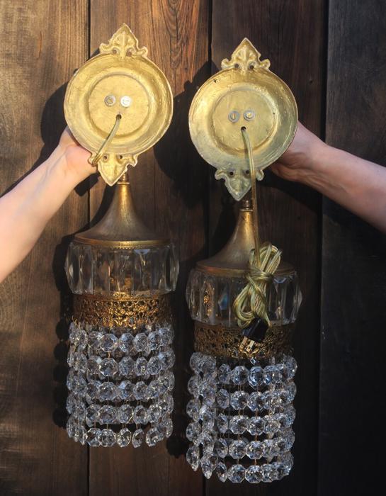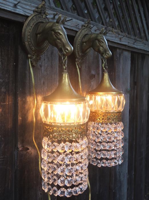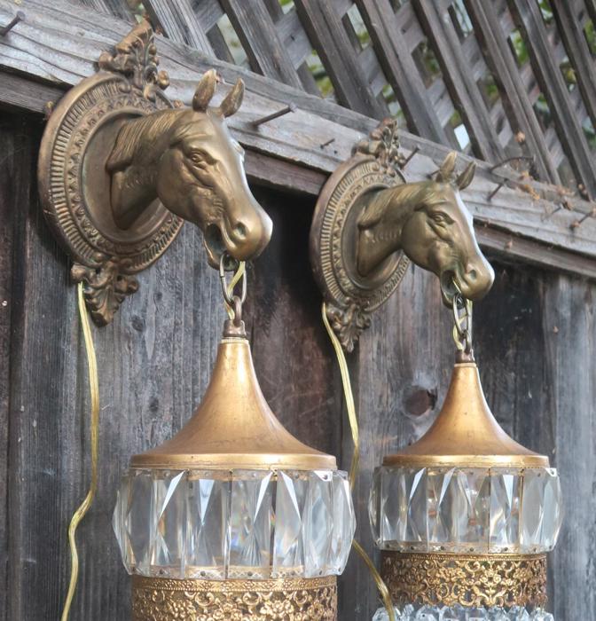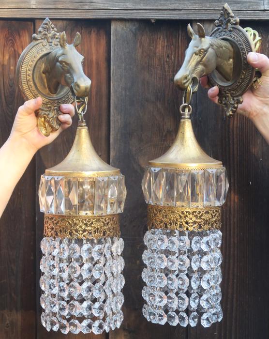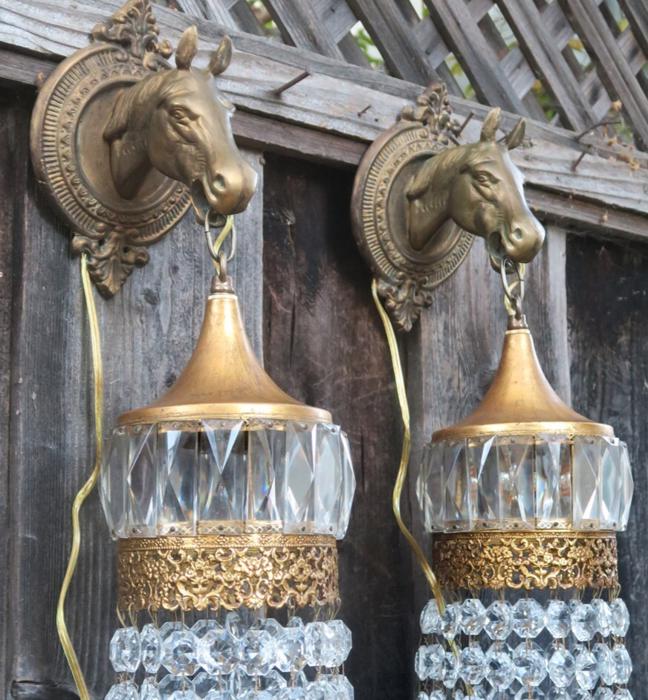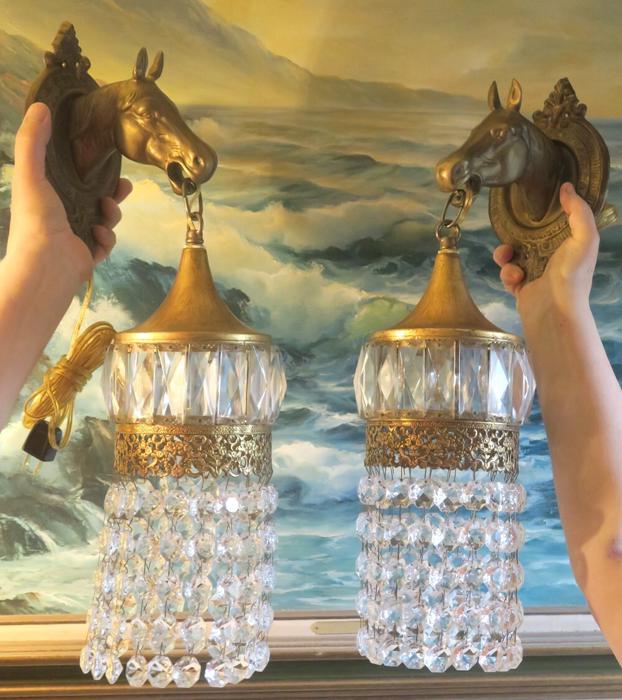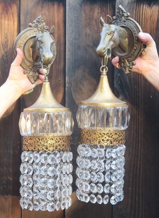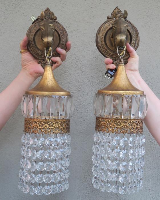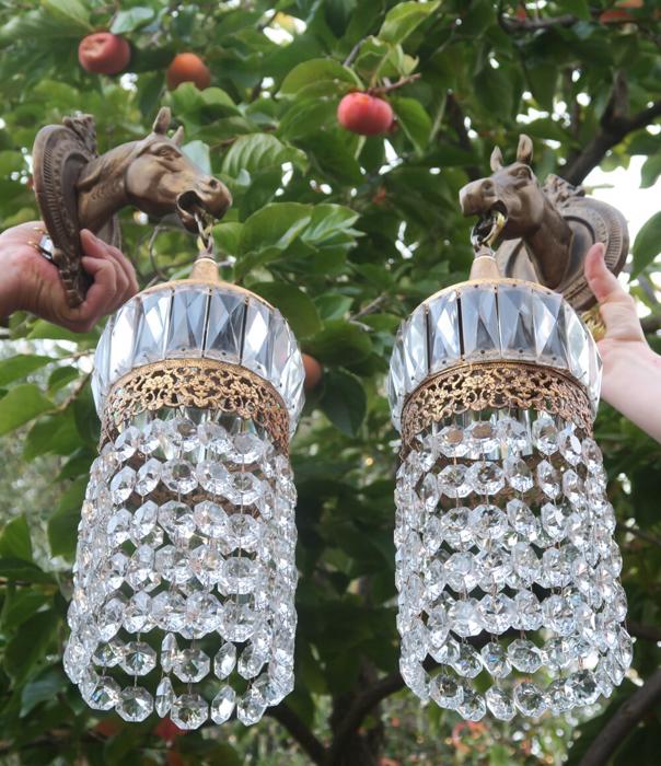 2 Vintage Brass lamp Sconce Horse hanging jeweled tole lantern shades with waterfall of dripping clear crystal large sized prism curtain garlands , Equestrian Barn lights - UNIQUE!! New Wiring. A truly unique pair of Horse head wall Sconces. Beautiful when lit. Each sconce is a 1 light fixture. Great design with horse heads and hanging ornate relief bronze meal lanterns with old dark patina, So charming ! each lantern has dripping clear crystal prisms cascading in layers looking like water fountains. Ornate elaborate back plates with dark patina; Great working order with new wiring and porcelain sockets, these sconces come with long cords with switch in line and plug at the back. I believe these vintage sconces would date somewhere from 1940s. These are European sconces I believe, French or Spanish; Sconces are one light fixtures (bulbs not incl.); The sale is for a Pair (set of 2 sconces). Great working condition with new wiring and porcelain sockets. Glass shade lanterns are all intact with all prisms that are there none missing or broken and sconces are in great old vintage condition ready to hang in your home. Please see photos, they part of description! These sconces measure 22" by 6.5" wide by 8" deep, each lantern is 14.5" tall by 6.5" wide and the back plates are 5 5/8" wide