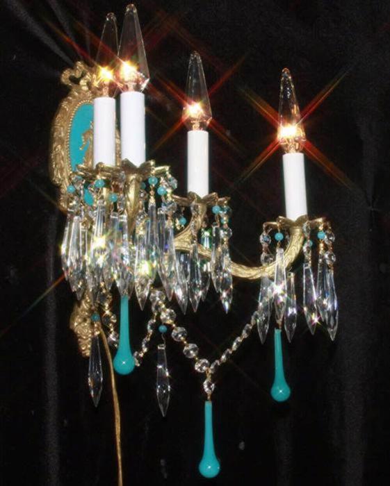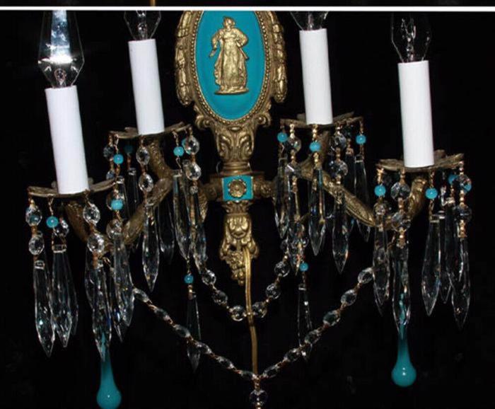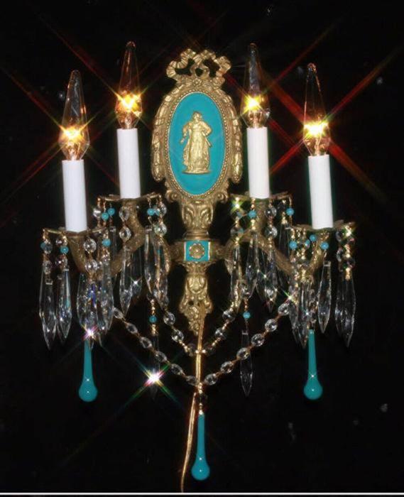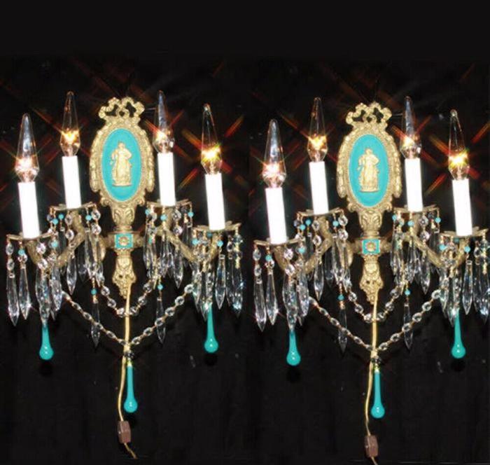 Great PAIR of Vintage 4 light Wedgwood style inspired Architectural garden classical cameo lady sconces~ wall lamps chandeliers ~ Accent lights~ ~Dripping with Cascading Clear crystal Prisms~ A beautiful pair of lady cameo sconces in Wedgwood style design. Encasing the cameo style plaque are swirly laurel leaf swag wreath garlands. The top of the sconces have an ornate bow ribbons. The sconces are adorned dripping French U-drop Crystal Prisms and opaline Blue beads. The metal is brass or bronze with gilt finish and old charming patina. Beautiful when lit. Each sconce is a 4 light fixture. Great working order with New wiring and are ready for hanging in your home. The sconces come with cords with switches so you can plug them into an outlet and hang anywhere in the room. Sconces use small base chandelier bulbs (not incl.). The sale is for a pair. No broken or chipped crystals or beads. Please see photos, they part of description! The sconces measure about 20" tall, and about 15" at the widest