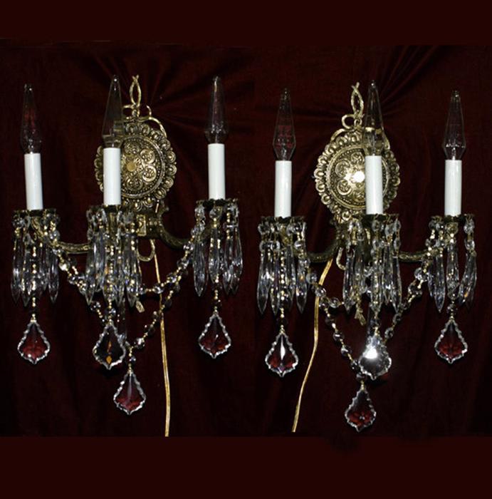 Great PAIR of old French Bow top Rococo Style Sconces ~ wall chandeliers ~ Accent lights~ ~Dripping with Tons of Cascading Clear crystal Prisms~Offered this beautiful pair of Sconces with Crystal Prisms and garland swags. The metal is Bronze (or it may be cast brass) with beautiful gilt plated original finish and old charming patina. Beautiful design with Bow tops and ornate designs. Each sconce is a 3 light fixture. Great working order ready for hanging in your home. The sconces can be wired into a wall - as these are wall fixtures and come with mounting hardware; or, cords with switches can be added to plug in these into an outlet and hang anywhere in the room. I believe these vintage sconces would date somewhere from 1940-1950-s. These are European sconces, French Rococo style, marked Spain. Sconces use small base chandelier bulbs -6 of them up to 75watt each (not incl.). Please note that the designer pointed spear bulbs shown in the photos are available and sold separately. The sale is for a pair (2 sconces). No broken or chipped prisms. Please note: all prisms are clear crystal and taken on burgundy background. Please see photos, they part of description!measure total with prisms about 17" tall, 11.25" wide and about 6.5" deep