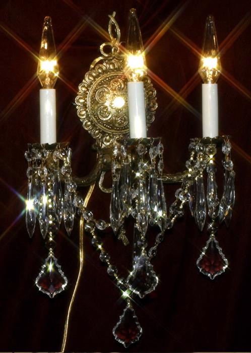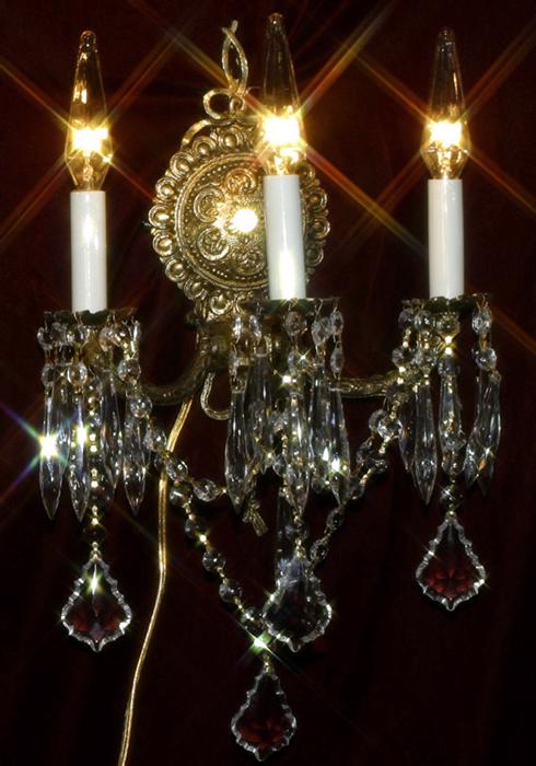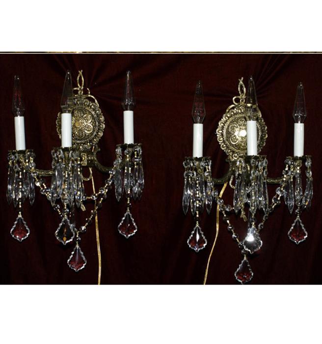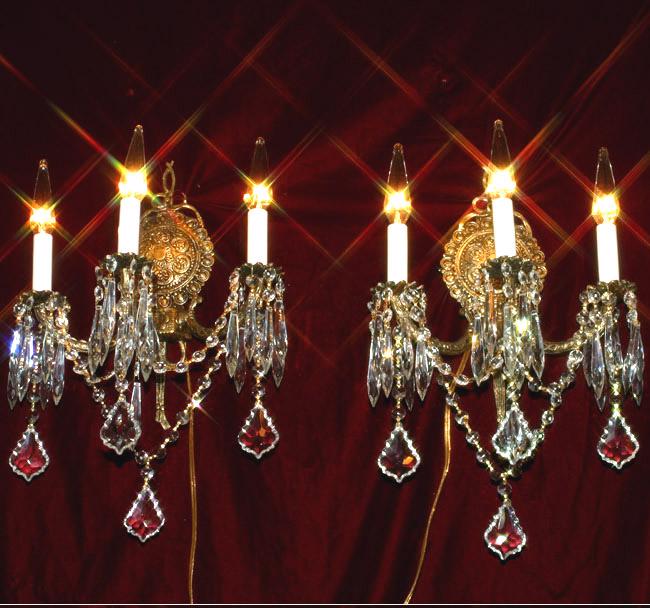 Great PAIR of old French Bow top Rococo Style Sconces ~ wall chandeliers ~ Accent lights~ ~Dripping with Tons of Cascading Clear crystal Prisms~Offered this beautiful pair of Sconces with Crystal Prisms and garland swags. The metal is Bronze (or it may be cast brass) with beautiful gilt plated original finish and old charming patina. Beautiful design with Bow tops and ornate designs. Each sconce is a 3 light fixture. Great working order ready for hanging in your home. The sconces can be wired into a wall - as these are wall fixtures and come with mounting hardware; or, cords with switches can be added to plug in these into an outlet and hang anywhere in the room. I believe these vintage sconces would date somewhere from 1940-1950-s. These are European sconces, French Rococo style, marked Spain. Sconces use small base chandelier bulbs -6 of them up to 75watt each (not incl.). Please note that the designer pointed spear bulbs shown in the photos are available and sold separately. The sale is for a pair (2 sconces). No broken or chipped prisms. Please note: all prisms are clear crystal and taken on burgundy background. Please see photos, they part of description!measure total with prisms about 17" tall, 11.25" wide and about 6.5" deep