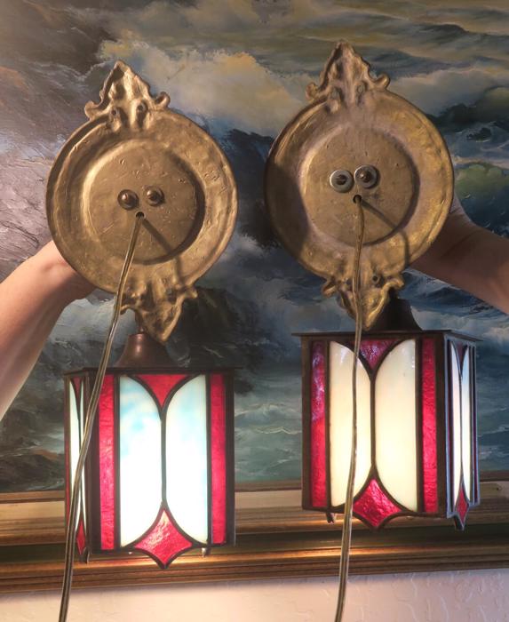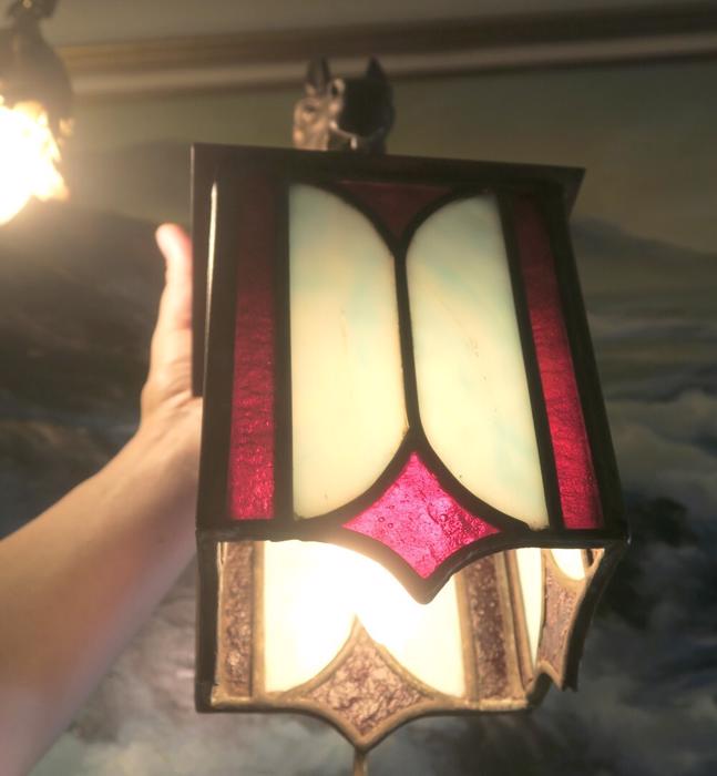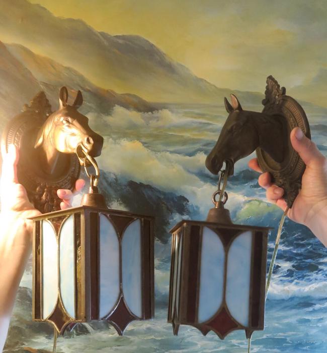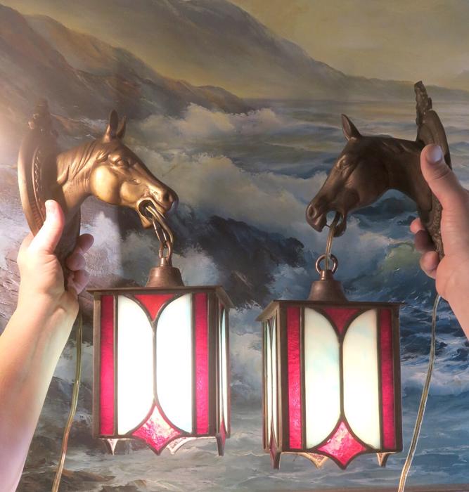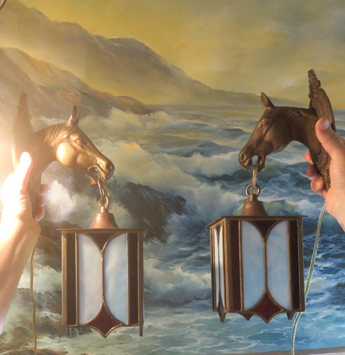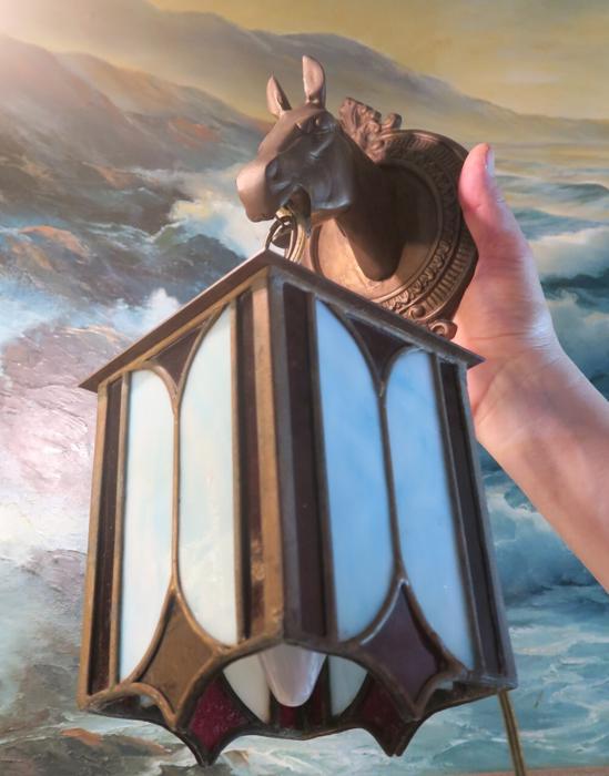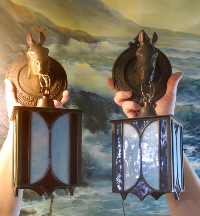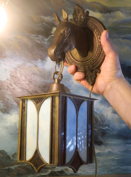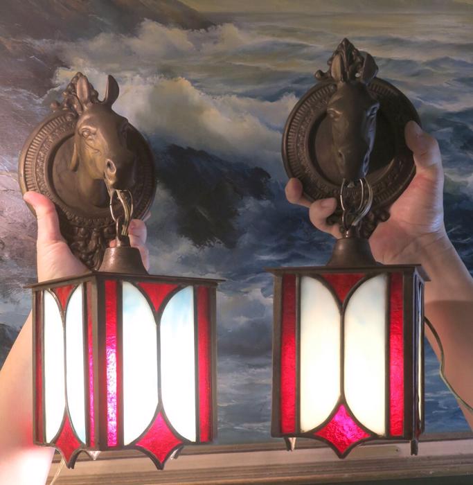 A UNIQUE Pair Vintage Brass lamp Sconce Horse hanging Gothic Inspired design lantern shades with Mission antique incased slag glass in Blue and Ruby red inserts, Equestrian Barn lights. A truly unique pair of Horse head wall Sconces. Even more Beautiful when lit. Great design with horse heads and hanging tole metal lanterns with old incased glass on the lanterns. Elaborate figural back plates; Great working order ready for hanging. I believe these vintage sconces would date somewhere from 1940-1950-s or older. Charming patina on the metal which is in great condition. These are European sconces I believe, with Spanish Gothic inspired design; Sconces are one light fixtures that have a new wiring and porcelain sockets. Each sconce takes a standard size bulb (bulbs not incl.) and comes with long cords with switch in line and plug at the end; The sale is for a Pair. Great working condition. Glass shade lanterns have slag glass incased into the frame, all intact and sconces are in great condition ready to hang in your home. Brass has old patina from age with shabby look that adds more charm to these old lights. Please see photos, they part of description.These sconces measure 17.5" tall by 5.5" wide by 7.5" deep the back plate is 5.5" wide, the lantern measures 5" by 7.5"