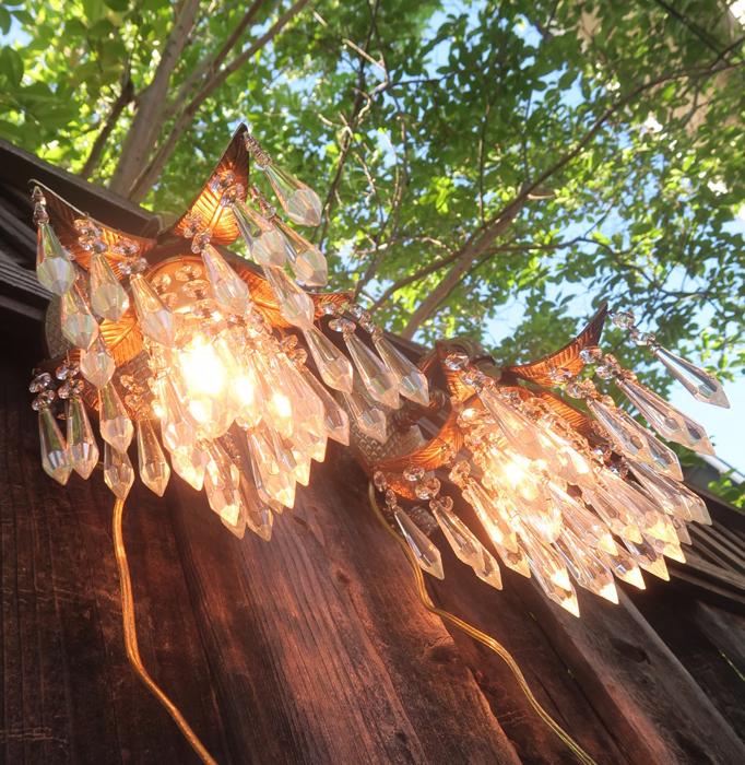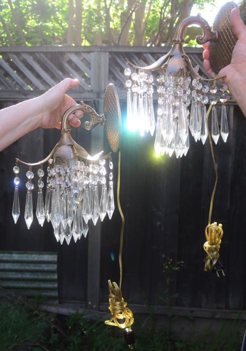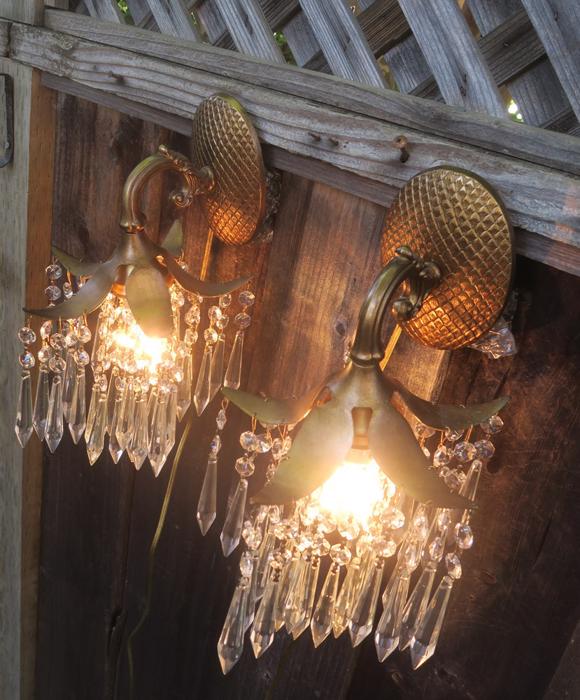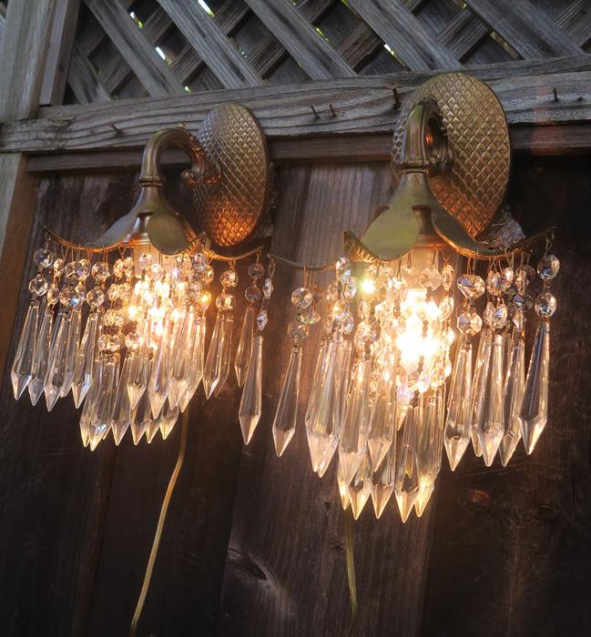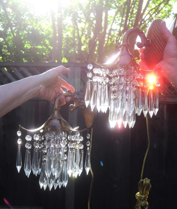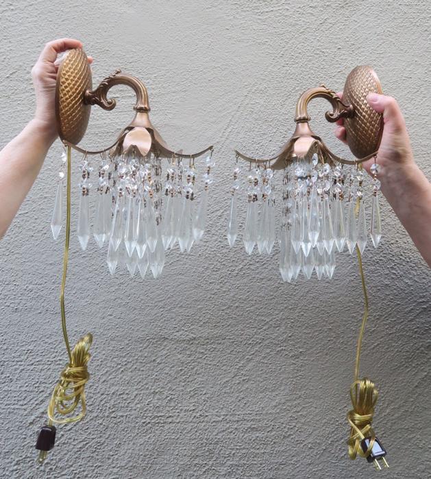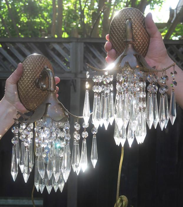 A Pair of Vintage Brass waterfall cascade Palm Fronds fountain with Crystal prisms Sconces NEW Wiring /porcelain sockets~ with long plugin cords - ready to hangBeautiful pair of Sconces with dripping waterfall of Crystal Prisms and garland swags. The metal is cast brass. Beautiful design with ornate arms with hanging Palm tree frond shaped lanterns. Each sconce is a 1 light fixture. Great working order with new porcelain sockets. Each back plate has a hanger at the top for hanging these on the wall; the sconces come with a long plugin cords with switch in line and plug at the end; cords are about 8' feet long plug these into an outlet and hang anywhere in the room. New wiring and porcelain sockets. Sconces use standard base bulbs -1 of them on each up to 150 watt (not incl.). The sale is for a pair- as shown. We do have multiples available, in case you need more than one pair. No broken or chipped prisms. Please see photos, they part of description!These measure total with prisms about 12.5" tall, by 8.5" at the widest side and by 8.5" deep ; the back plate and about 5.75" tall by about 4" wid