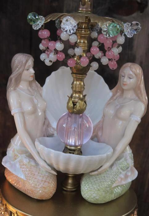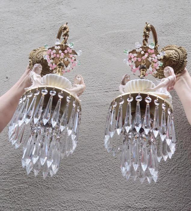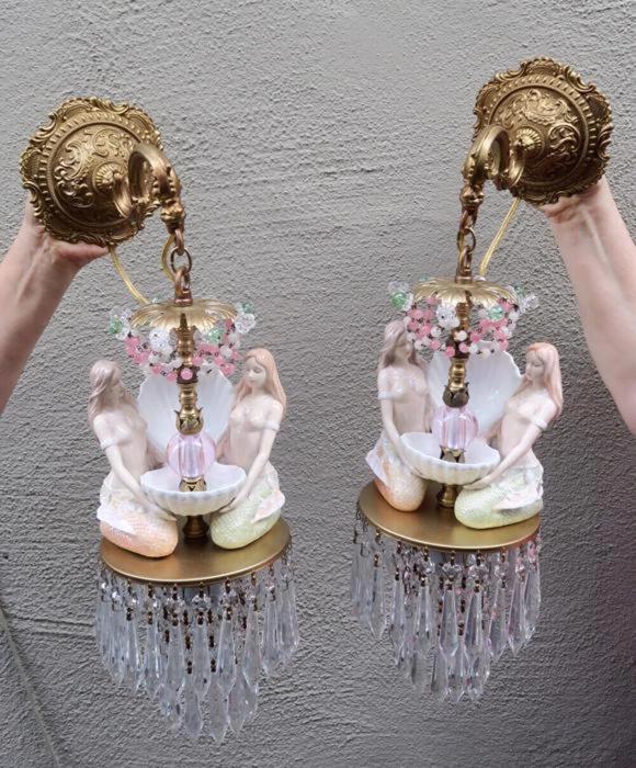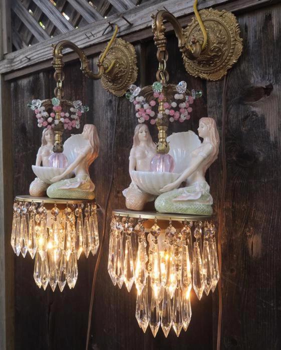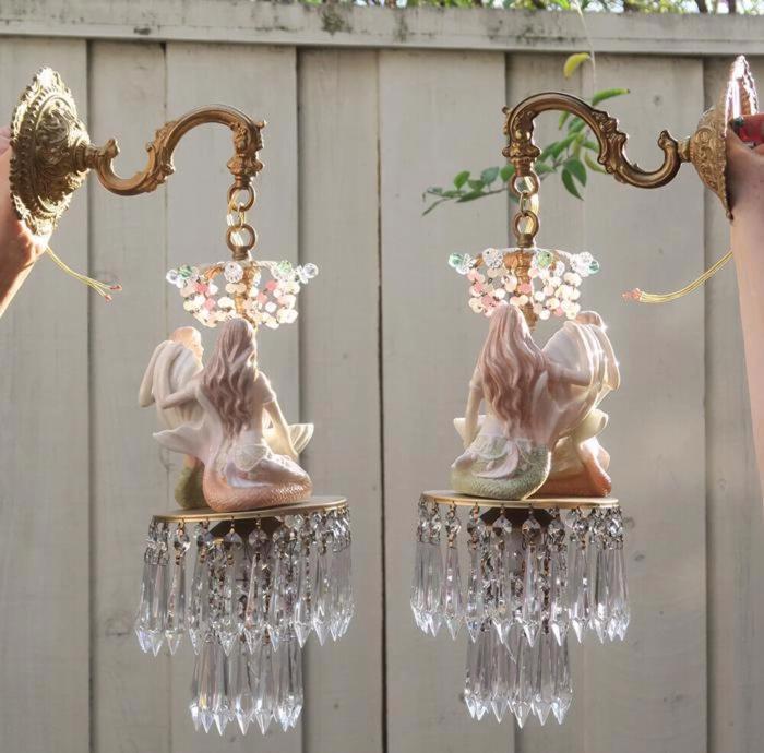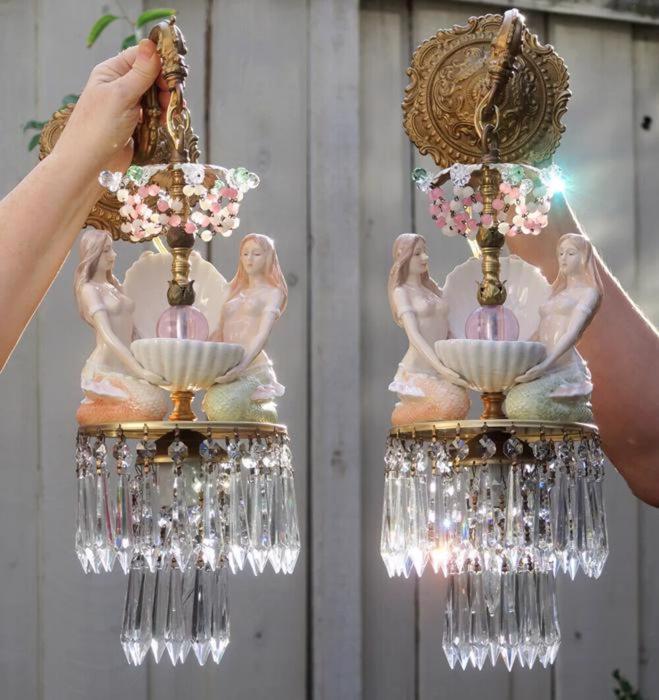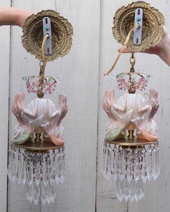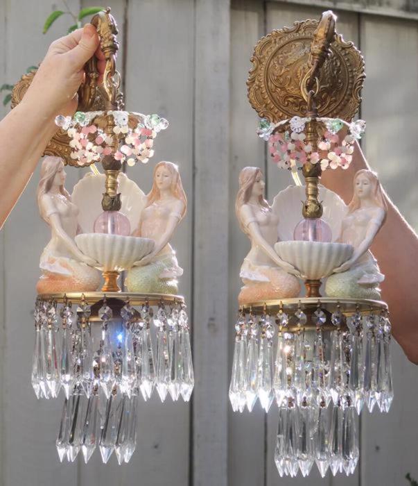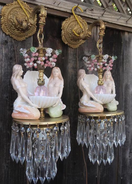 A rare pair of wall sconces Accent light ~ very ELEGANT and CLASSY wall chandeliers with Sparkling, Glitzy .... Clear Crystal Prisms. The Metal is a combination of cast brass/bronze with tole metal. Beautiful set of mermaid sconces; Porcelain in absolutely great condition - so are the prisms and the Opaline art glass beads and macaroni bead garlands. There are two nude mermaids on each sconce sitting and holding a seashell with pink glass jewel "mother of pearl" inspired design pink glass ball; New wiring and porcelain sockets, ready to hang in your home; these are wall fixtures and come with mounting hardware; the sconces are cast brass/bronze with beautiful old patina; Please see the photos for more details - they are part of description. The sale is for a Pair- 2 sconces- as shown. Great, fully working condition with No missing, cracked broken pieces. Each sconce has one light and uses a standard base size light bulb (not incl.). These sconces total with prisms measure in total 21.5" tall by 7" at the widest point; and about 9.5" deep. The back plates are 5.5" in diameter.
