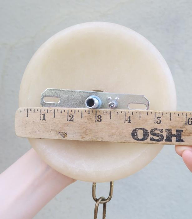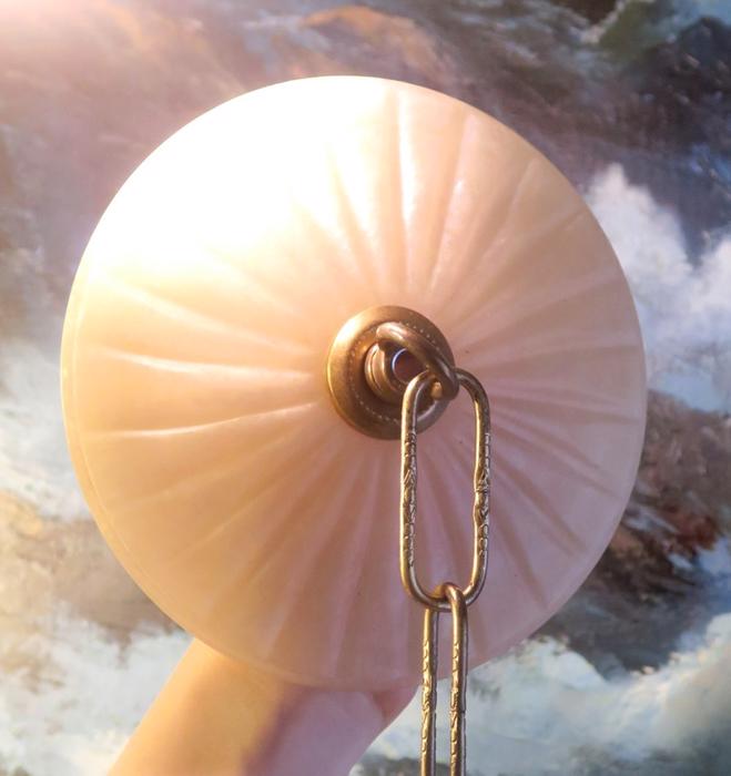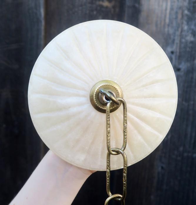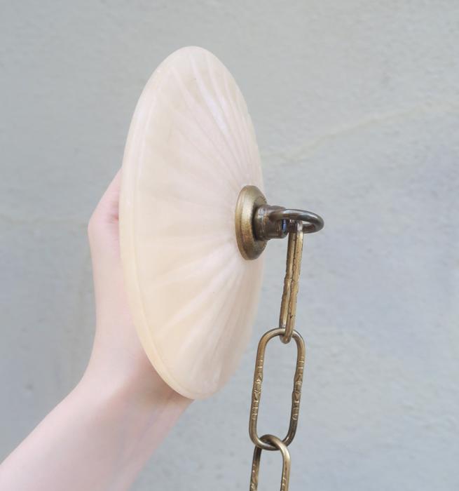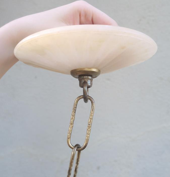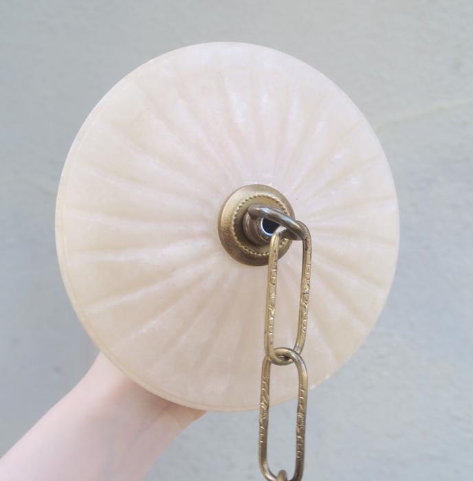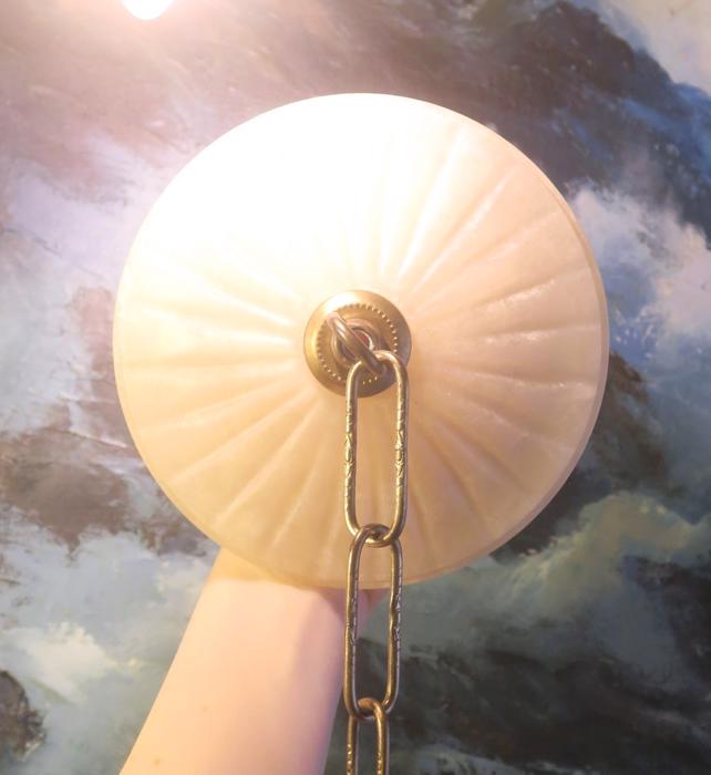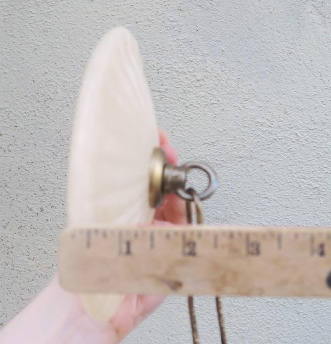 Please refer to the photos for the measurements**** the canopy measures 5.75" in diameter; the ornate chain Measures about 12.75" long. (if a longer chain is needed- just let me know). Vintage carved Alabaster ceiling canopy with mounting hardware part set - a great part to use to hang your lamp or chandelier; Good condition - as shown - ready to use. Please see photos, they are part of description; the sale is for one set.