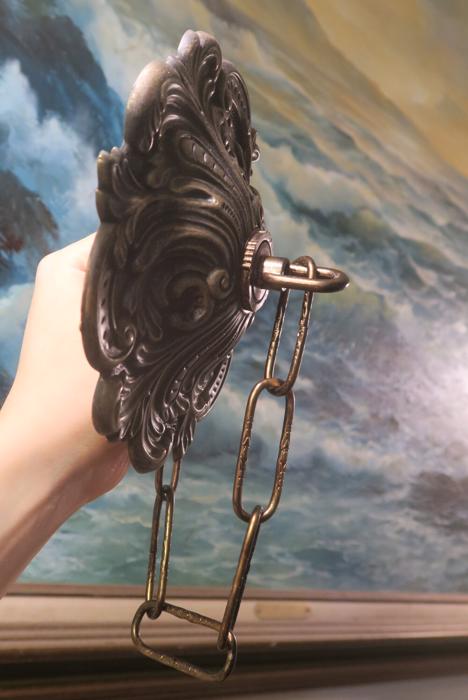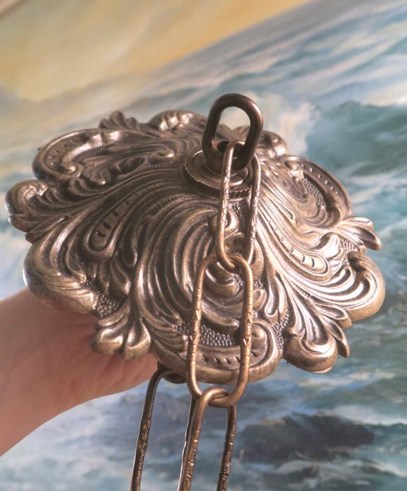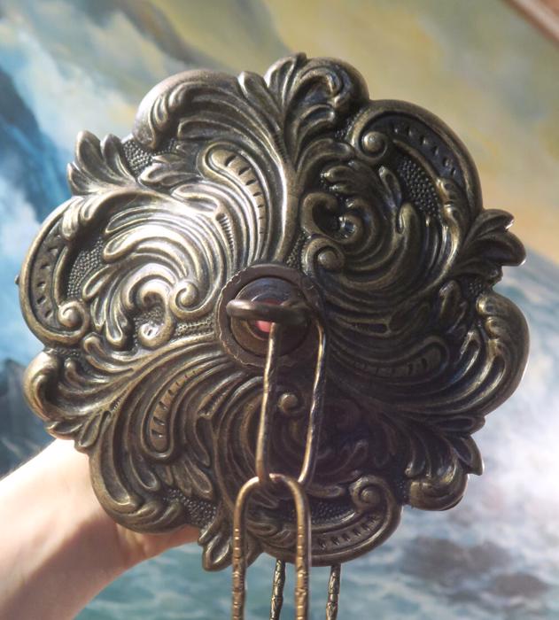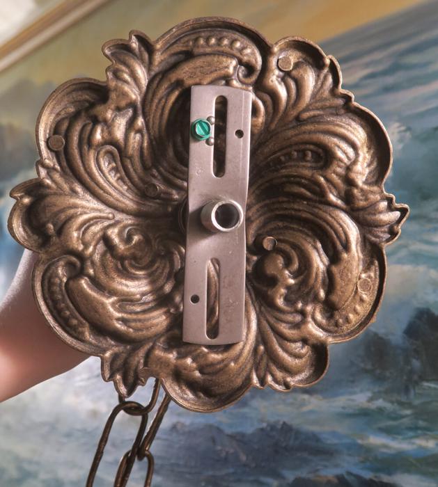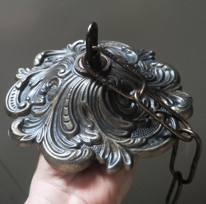A large ornate Vintage cast brass Black and gold plated with dark patina flur-de-lis Ceiling cap canopy with chain for hanging lamp chandelier part set Measurements are: about 6.25" INCHES WIDE, 1 INCH HIGH, 1 INCH CENTER HOLE; the ornate Chain Measures about 12.5" inches long. Flur-de-lis ornate relief design; (if a longer chain is needed, let me know). A heavy cast brass metal with black and gold finish with great patina ceiling cap canopy with mounting hardware part set - a great part to use to hang your lamp or chandelier; Good condition, as shown - ready to use.