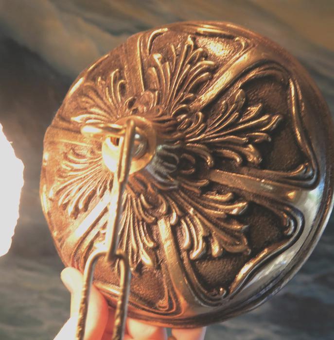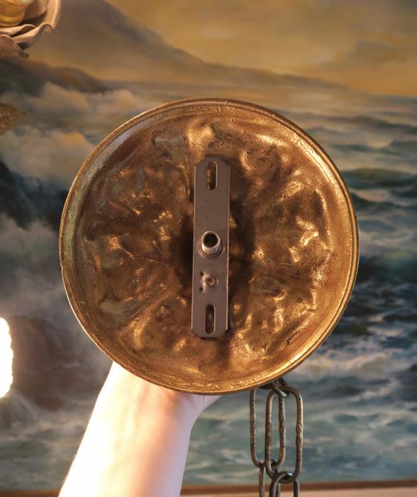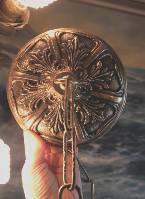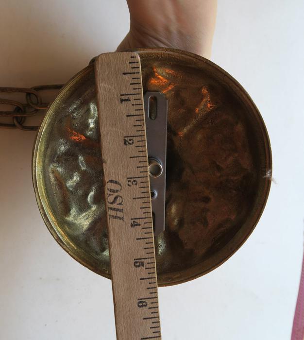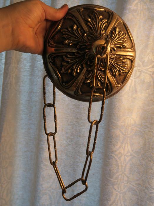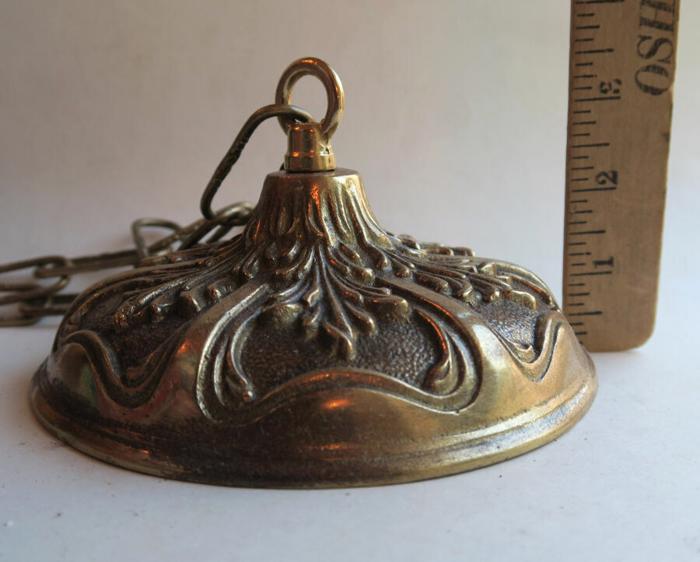 Please refer to the photos for the measurements***; The chain is 12.5" inches - if a longer chain is needed- let me know. Vintage heavy solid cast brass /bronze ceiling canopy with mounting hardware part set - a great part to use to hang your lamp or chandelier; the Canopy has an original finish with old patina look and very intricate ornate relief detailed casting. Good condition - as shown - ready to use- Please see photos, they are part of description; the sale is for one set as shown.