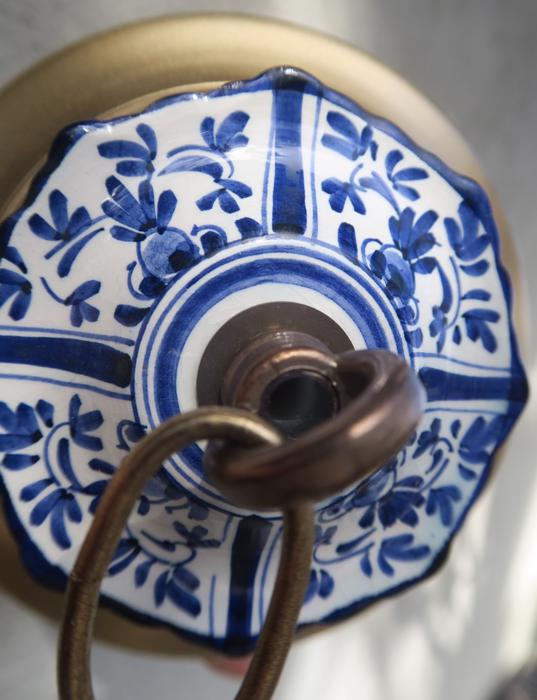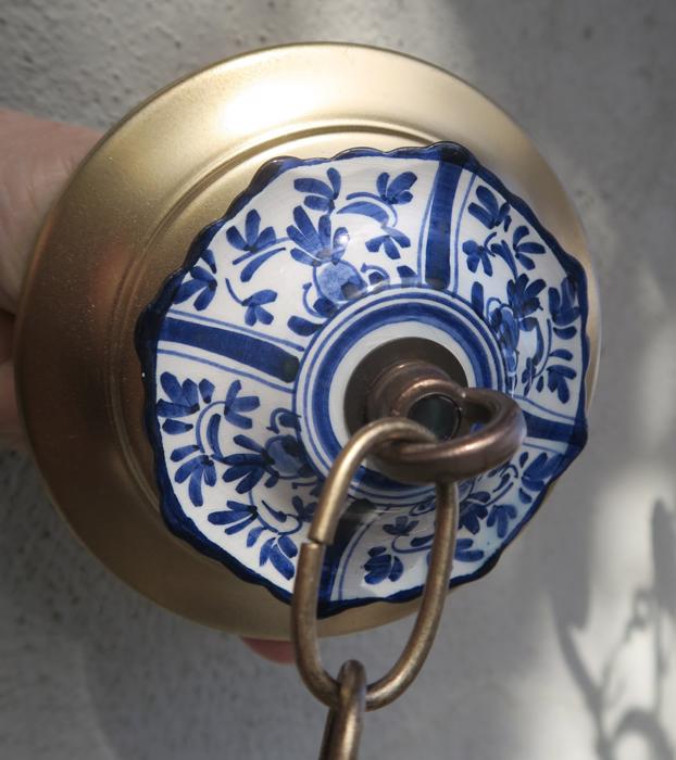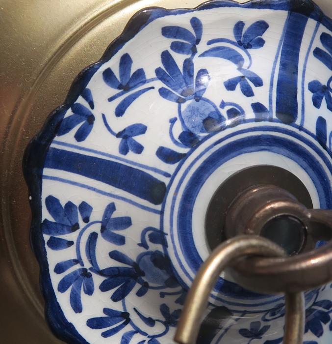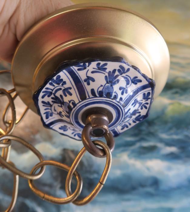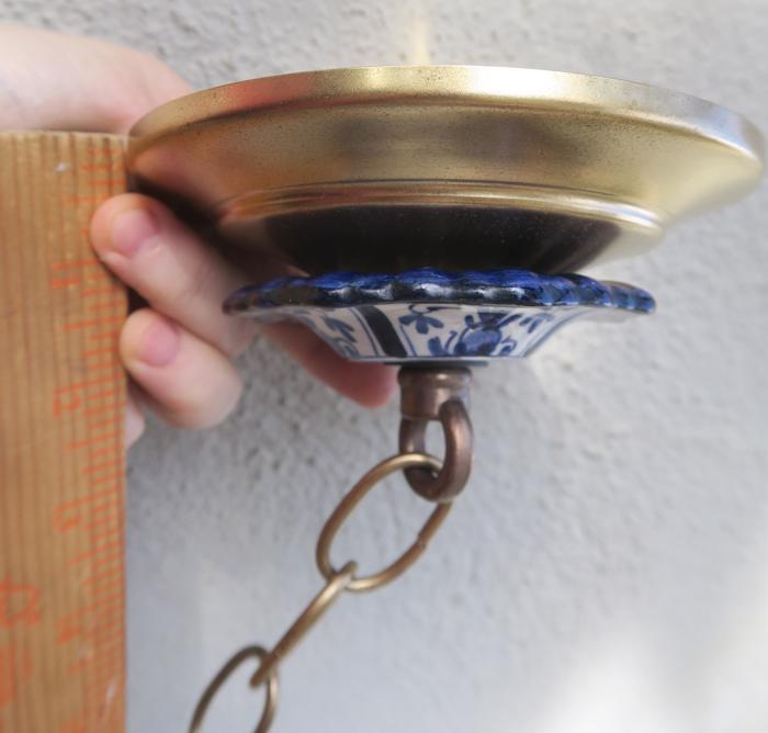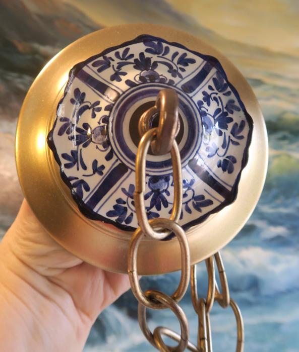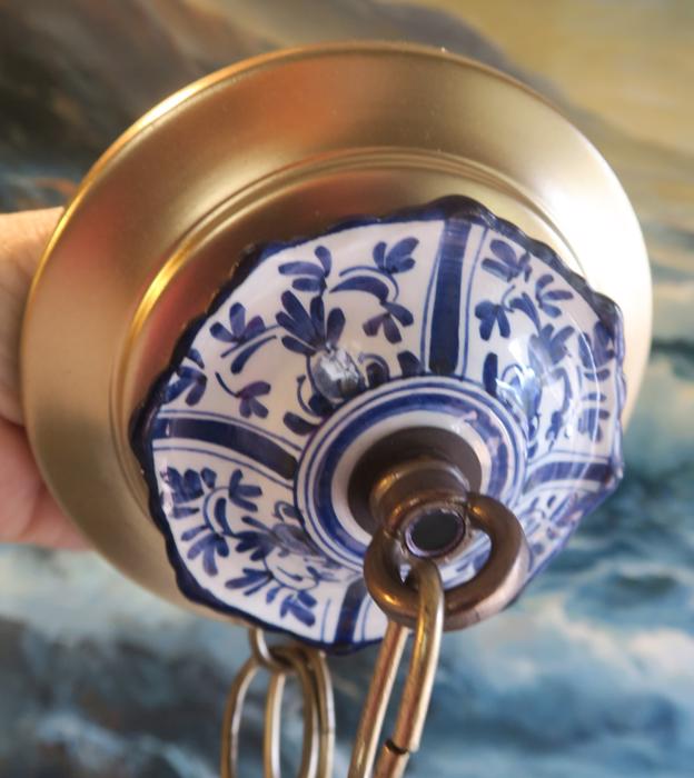 Canopy ceiling cap part Tole Vintage Delft Blue Dutch porcelain lamp chandelier , handpainted.Please refer to the photos for the measurements**** the canopy is 5" in diameter; the ornate chain Measures about 12.5" long. Porcelain with handpainted delft Blue ornate designs; Great condition - as shown - ready to use- not marked; Please see photos, they are part of description; the sale is for one set as shown.