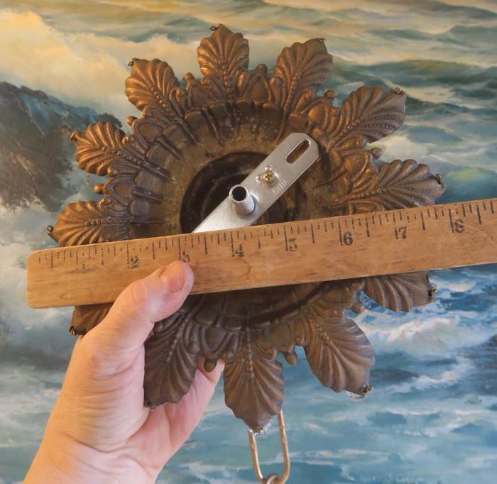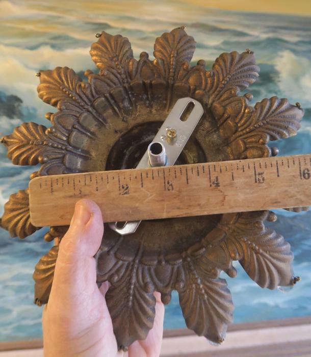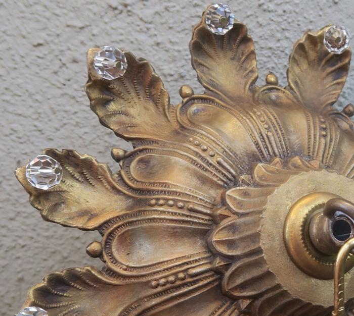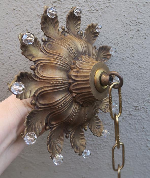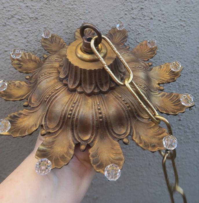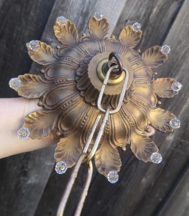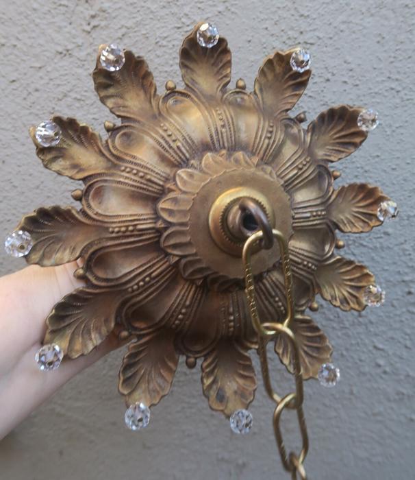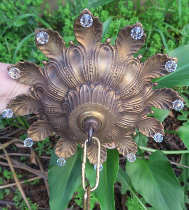 1 large old Beaded Vintage cast Spelter metal Ceiling cap canopy with mounting hardware and chain hanging lamp chandelier part set , French~ Italian ~ Spanish - crown leaf ornate relief pattern Please refer to the photos for the measurements*** The canopy is 8" at the widest point and the ornate Chain Measures about 12.5" long. Vintage cast spelter metal with gold brass plated bright finish and great patina ceiling cap canopy with mounting hardware part set - a great part to use to hang your lamp or chandelier; the Canopy is a cast spelter metal with original gilt finish and very intricate ornate relief detailed casting, and clear faceted beads all around the rim; Great condition, all beads intact - as shown - ready to use. Please see photos, they are part of description;