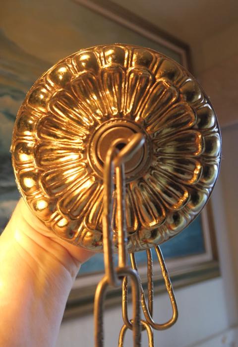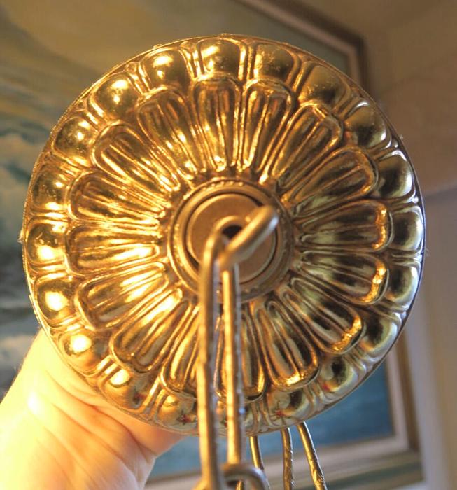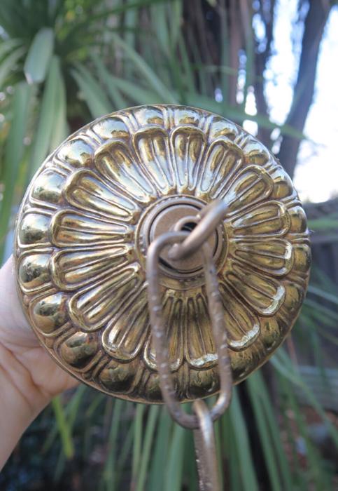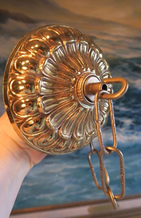 1 old large ornate Vintage cast Spelter metal Ceiling cap canopy chain hanging lamp chandelier part set , relief ornate pattern Please refer to the photos for the measurements*** the ornate Chain Measures about 12.5" inches long. (if a longer chain is needed, let me know). Offered this Vintage heavy cast spelter metal with gold tone finish and great patina ceiling cap canopy with mounting hardware part set - a great part to use to hang your lamp or chandelier; the Canopy is a cast spelter metal with very intricate ornate relief detailed casting, Good condition , as shown - ready to use. Please see photos, they are part of description;