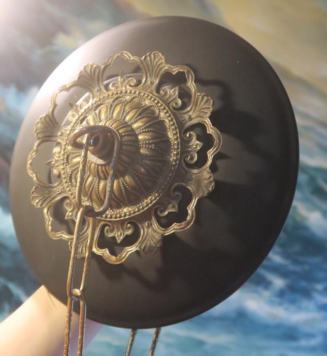 Please refer to the photos for the measurements****the ornate chain Measures about 12.5" long. (if a longer chain is needed- please let me know). Vintage brass with spelter metal Relief Acanthus leafs center on black cap ceiling canopy rosette medallion with mounting hardware part set - a great part to use to hang your lamp or chandelier; Good condition - as shown - ready to use- Unmarked, but it is European origin; Please see photos, they are part of description;