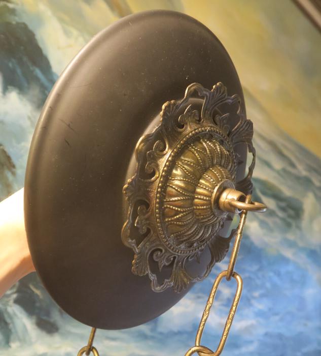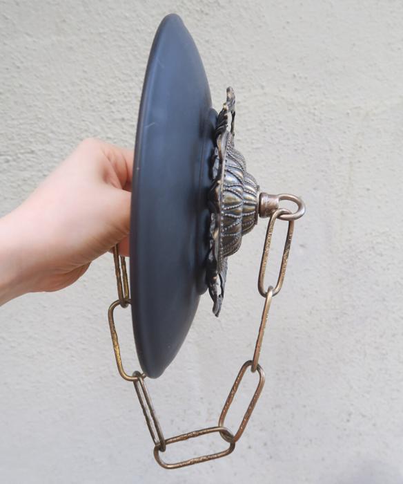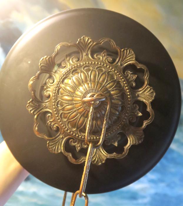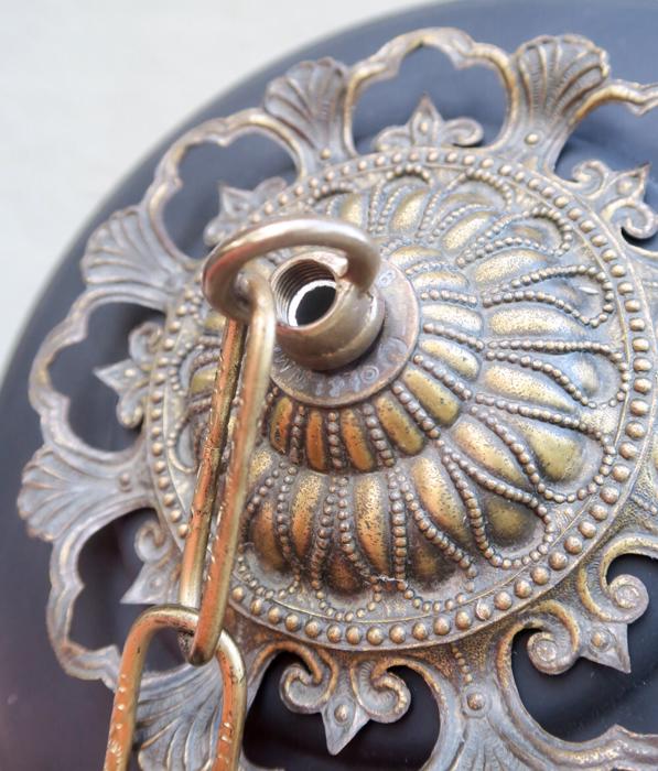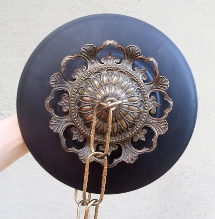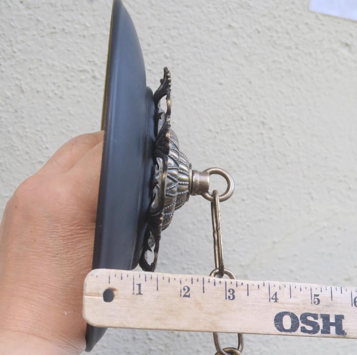 Please refer to the photos for the measurements****the ornate chain Measures about 12.5" long. (if a longer chain is needed- please let me know). Vintage brass with spelter metal Relief Acanthus leafs center on black cap ceiling canopy rosette medallion with mounting hardware part set - a great part to use to hang your lamp or chandelier; Good condition - as shown - ready to use- Unmarked, but it is European origin; Please see photos, they are part of description;