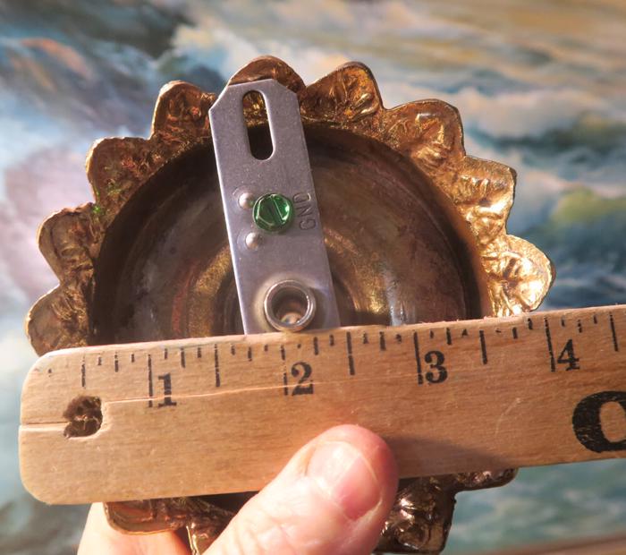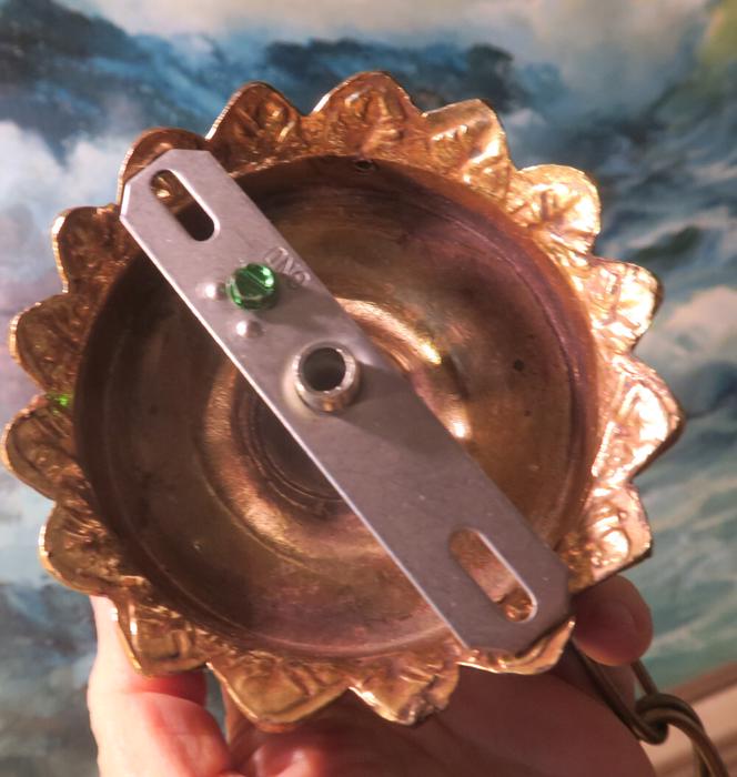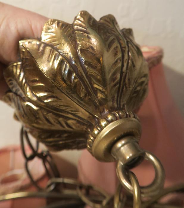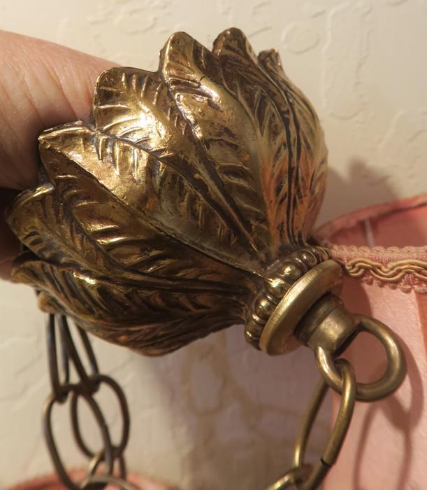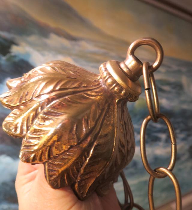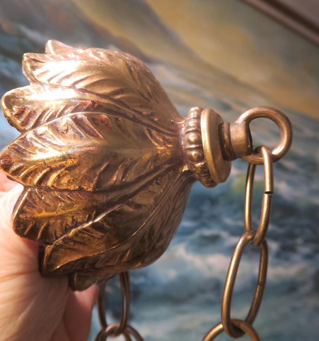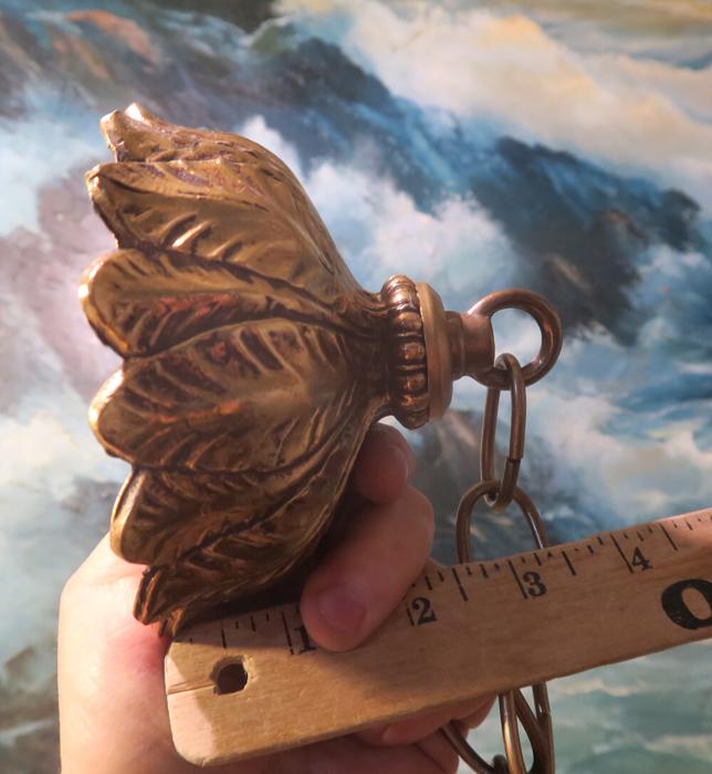 ceiling mount canopy part set Vintage Spelter brass plated gilt forest lily leaf design Please refer to the photos for the measurements*** the ornate Chain Measures about 12.5" inches long. Lily ornate relief design; (if a longer chain is needed, let me know)Vintage cast spelter metal with original brass plated gilt finish with great patina ceiling cap canopy with mounting hardware part set - a great part to use to hang your lamp or chandelier; Good condition, as shown - ready to use. Please see photos, they are part of description;