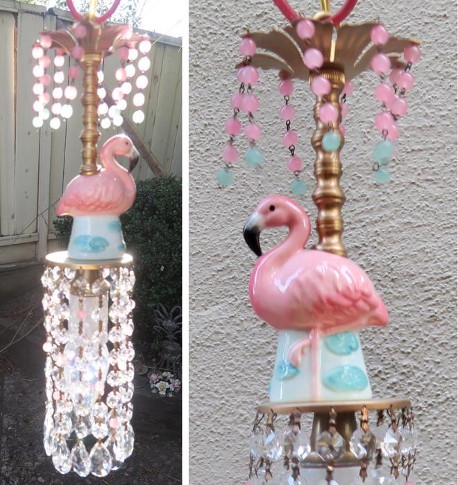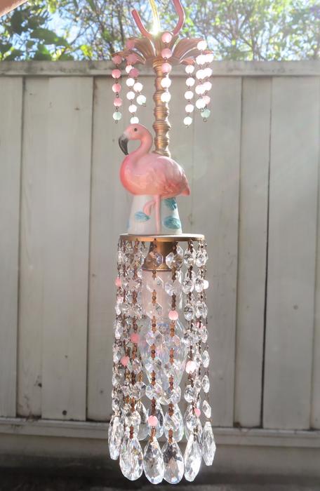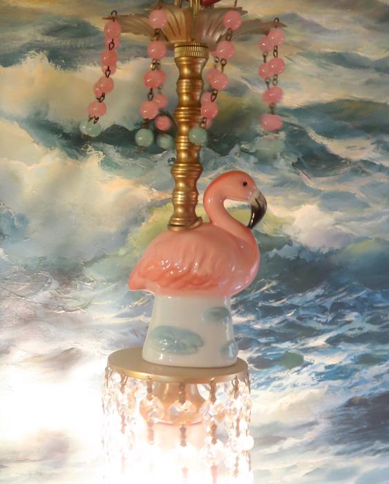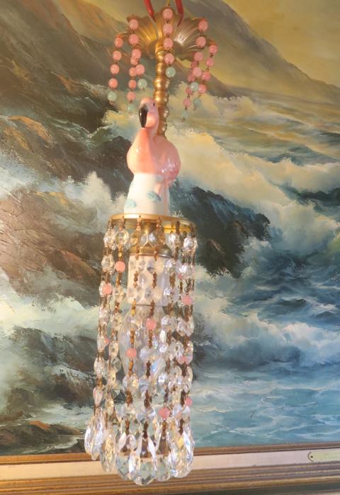 A beautiful, small sized handpainted ceiling chandelier-dripping with Sparkling , Glitzy .... European Icicle clear glass Crystal Prisms. Glass Opaline Pink and Jade green swag garlands dripping from the top crown leaf; Two tiers of large Icicle prisms around the bottom of the fixture; Fountain of dripping beads and crystals at the top bobeche. The metal on this lamp is a combination of brass and tole metal painted gold tone. The chandelier is a 1 light fixture, that takes a standard base size bulb up to 150 watt (not incl). New wiring and porcelain socket; It is a ceiling install fixture. Comes with a 30" long electrical cord and a canopy set with mounting hardware and 12.5" chain length- ready to install in your home. The sale is for one fixture only. Fully working condition; All prisms are intact, no chips, cracks etc.total measures about 15.5" tall x 4.25" at the widest point